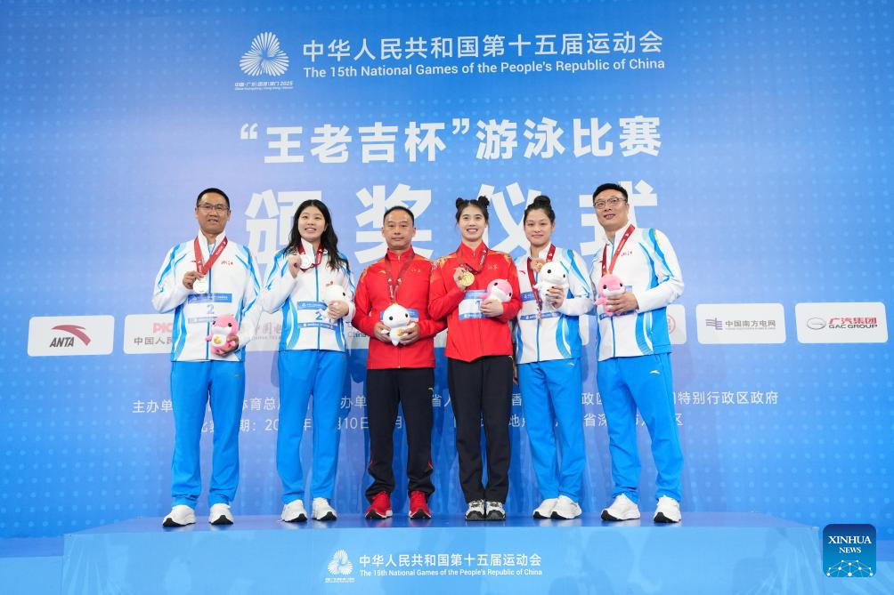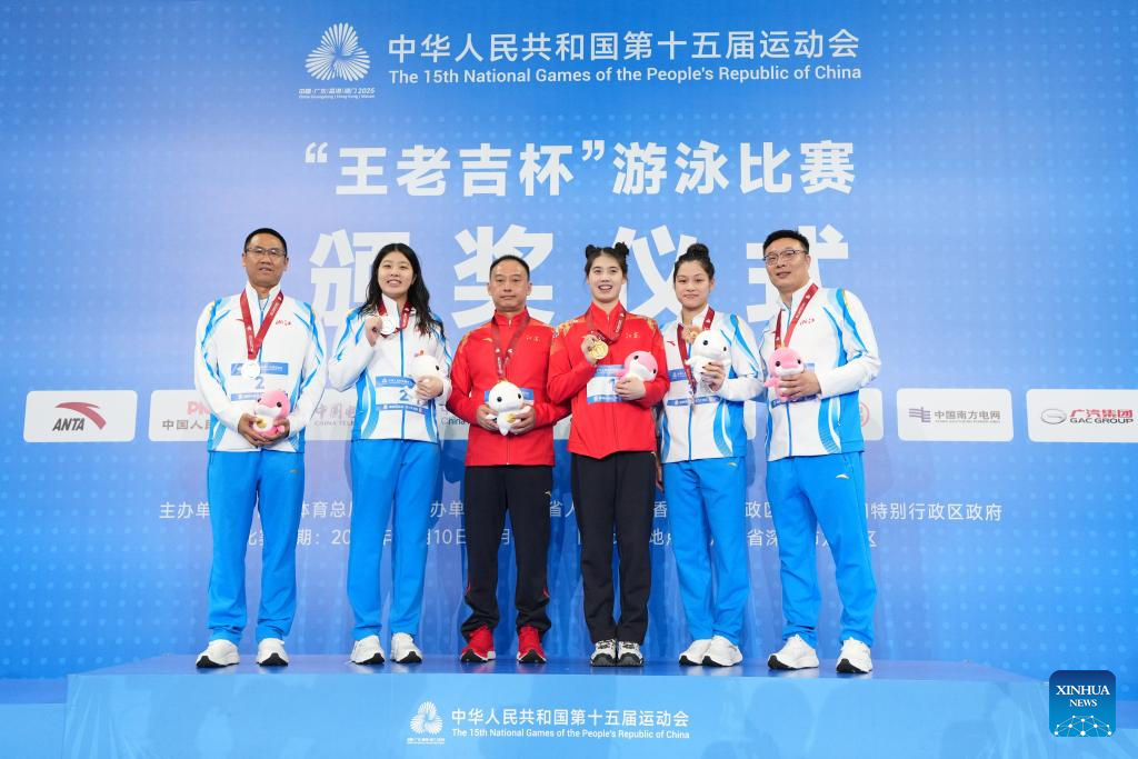 Gold medalist Zhang Yufei of Jiangsu, silver medalist Wu Qingfeng of Zhejiang and bronze medalist Yu Yiting of Zhejiang pose with their coaches during the awarding ceremony for the women's 50m butterfly of swimming at China's 15th National Games in Shenzhen, south China's Guangdong Province, Nov. 16, 2025. (Xinhua/Tenzin Nyida)