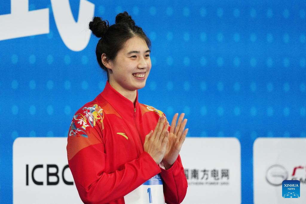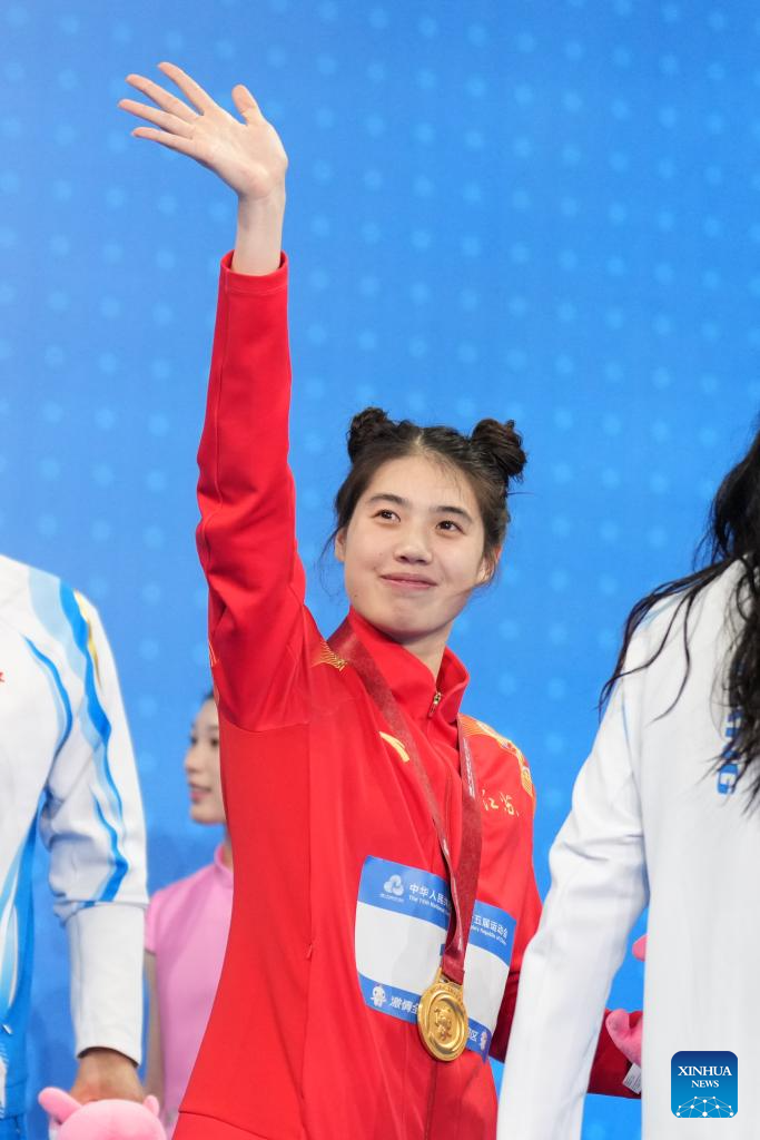 Gold medalist Zhang Yufei of Jiangsu greets the spectators during the awarding ceremony for the women's 50m butterfly of swimming at China's 15th National Games in Shenzhen, south China's Guangdong Province, Nov. 16, 2025. (Xinhua/Tenzin Nyida)