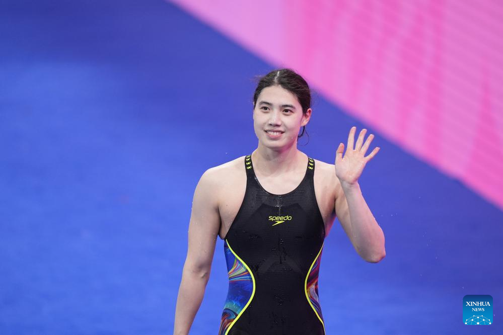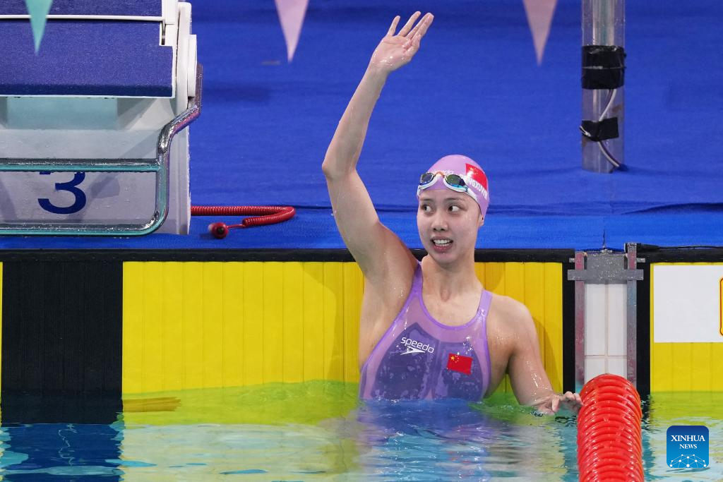 Zhang Yufei of Jiangsu greets the spectators after the women's 50m butterfly final of swimming at China's 15th National Games in Shenzhen, south China's Guangdong Province, Nov. 16, 2025. (Xinhua/Xue Yuge)