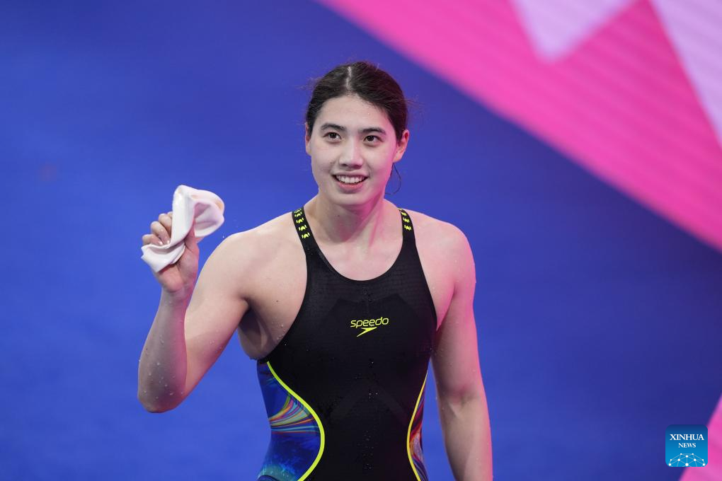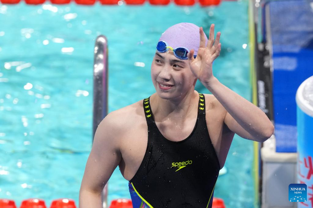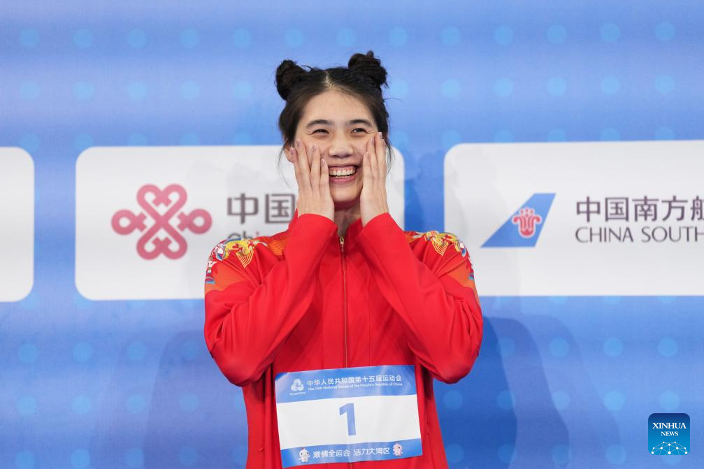 Peng Xuwei of Hubei reacts after the women's 200m backstroke final of swimming at China's 15th National Games in Shenzhen, south China's Guangdong Province, Nov. 16, 2025. (Xinhua/Xue Yuge)