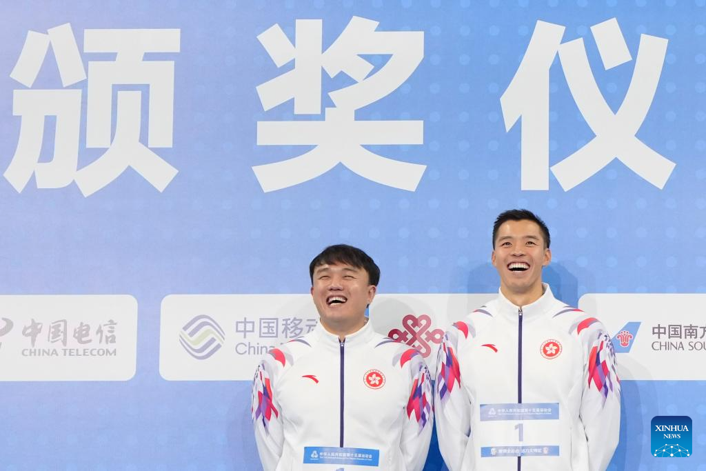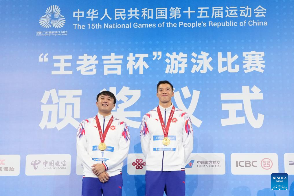 Gold medalist Ho Ian Yentou of Hong Kong poses with his coach during the awarding ceremony for the men's 50m freestyle of swimming at China's 15th National Games in Shenzhen, south China's Guangdong Province, Nov. 16, 2025. (Xinhua/Tenzin Nyida)