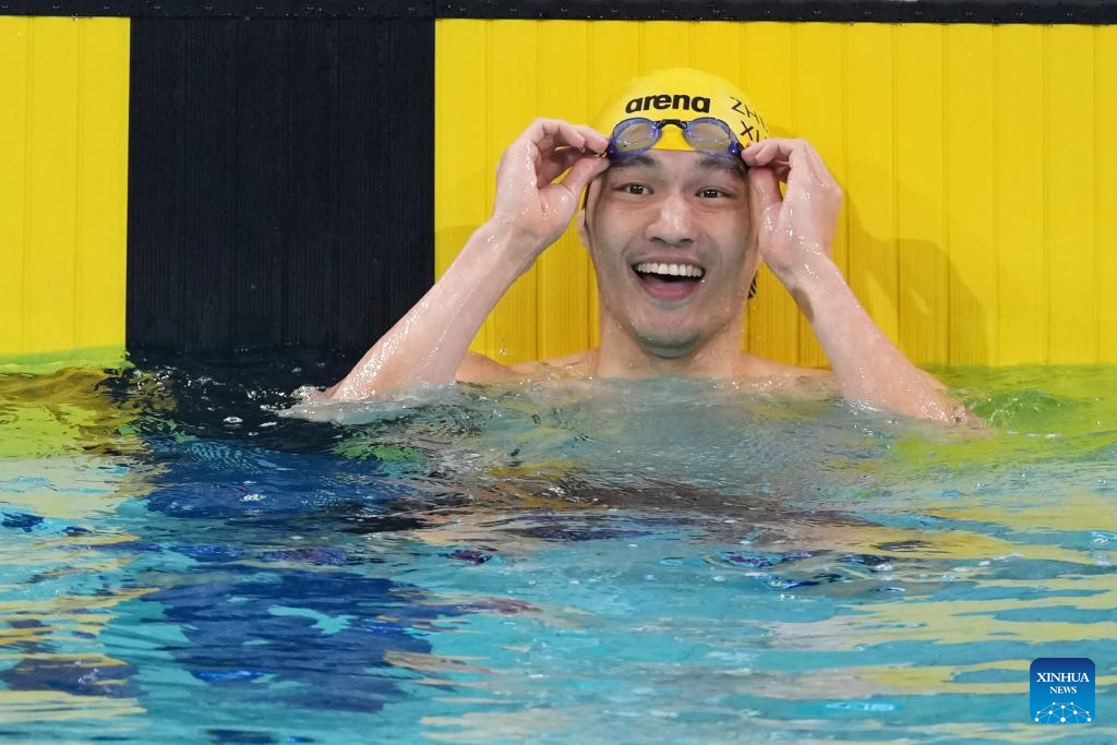 Xu Jiayu of Zhejiang reacts after the men's 50m backstroke semifinal of swimming at China's 15th National Games in Shenzhen, south China's Guangdong Province, Nov. 16, 2025. (Xinhua/Xia Yifang)
