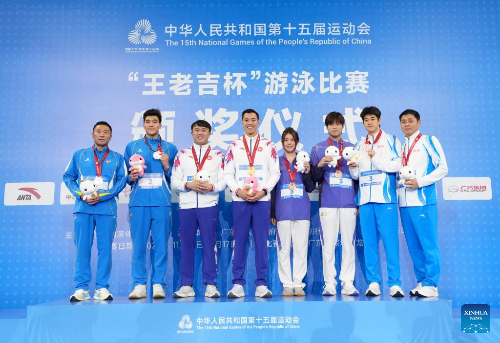 Gold medalist Ho Ian Yentou of Hong Kong, silver medalist Chen Hao of Liaoning, bronze medalists Liu Wudi of Fujian and Pan Zhanle of Zhejiang pose with their coaches during the awarding ceremony for the men's 50m freestyle of swimming at China's 15th National Games in Shenzhen, south China's Guangdong Province, Nov. 16, 2025. (Xinhua/Tenzin Nyida)