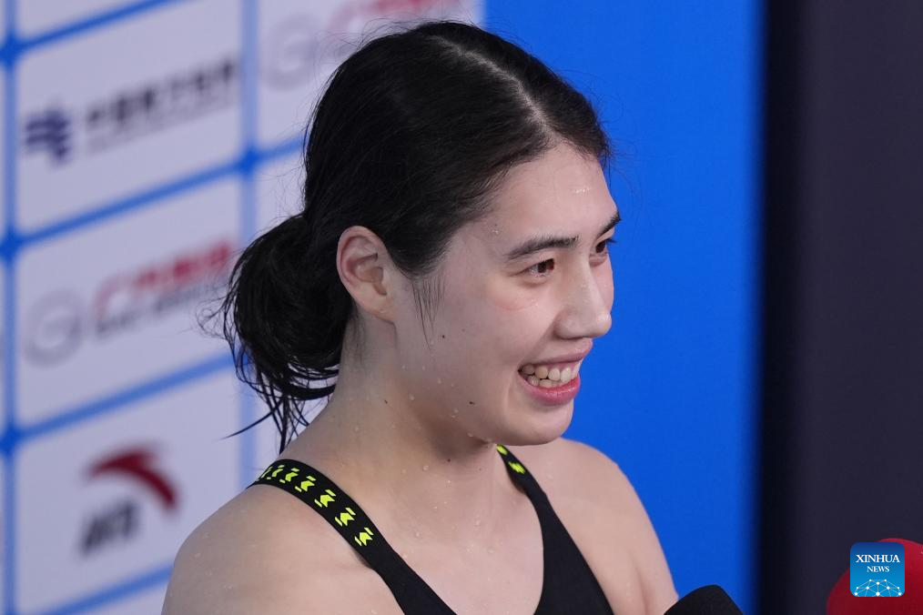 Zhang Yufei of Jiangsu is interviewed after the women's 50m freestyle semifinal of swimming at China's 15th National Games in Shenzhen, south China's Guangdong Province, Nov. 16, 2025. (Xinhua/Du Yu)