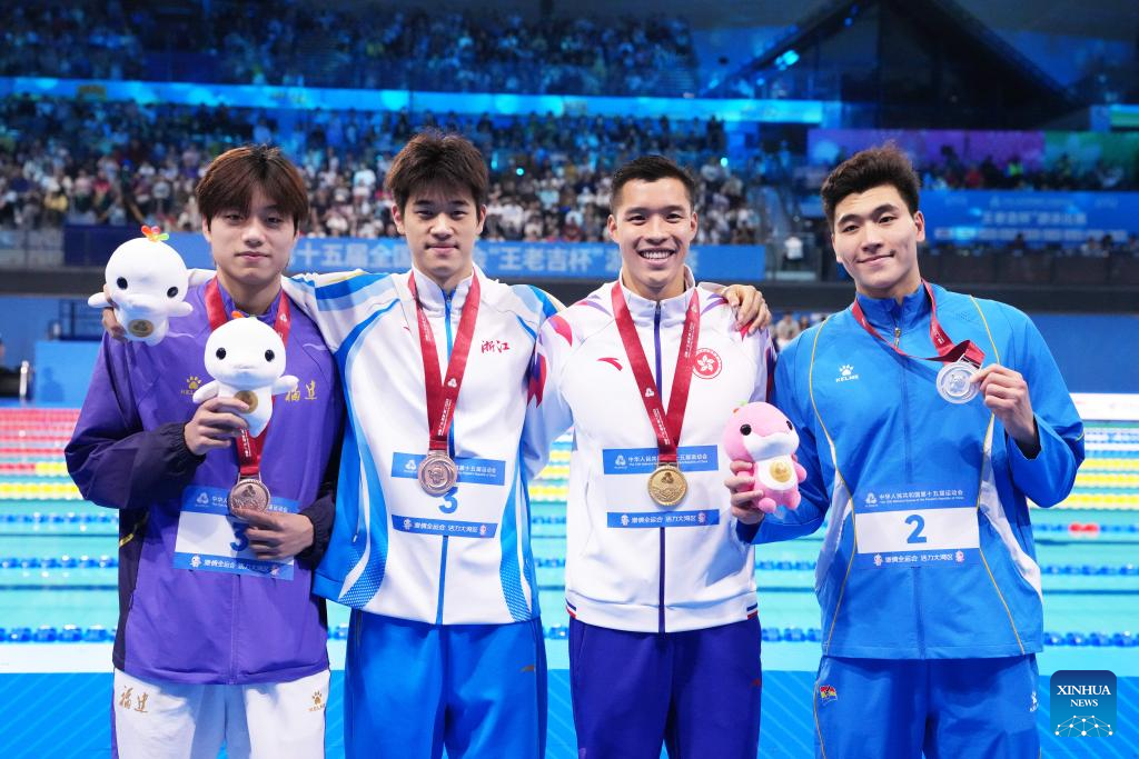 Gold medalist Ho Ian Yentou of Hong Kong, silver medalist Chen Hao of Liaoning, bronze medalists Liu Wudi of Fujian and Pan Zhanle of Zhejiang pose after the awarding ceremony for the men's 50m freestyle of swimming at China's 15th National Games in Shenzhen, south China's Guangdong Province, Nov. 16, 2025. (Xinhua/Xia Yifang)