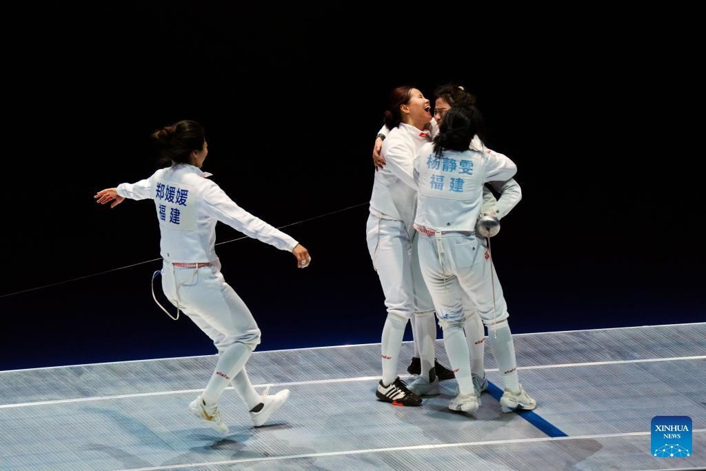 Athletes of team Fujian celebrate after winning the women's team epee final of fencing between Fujian and Anhui at China's 15th National Games in Hong Kong, south China, Nov. 18, 2025. (Xinhua/Zhu Wei)