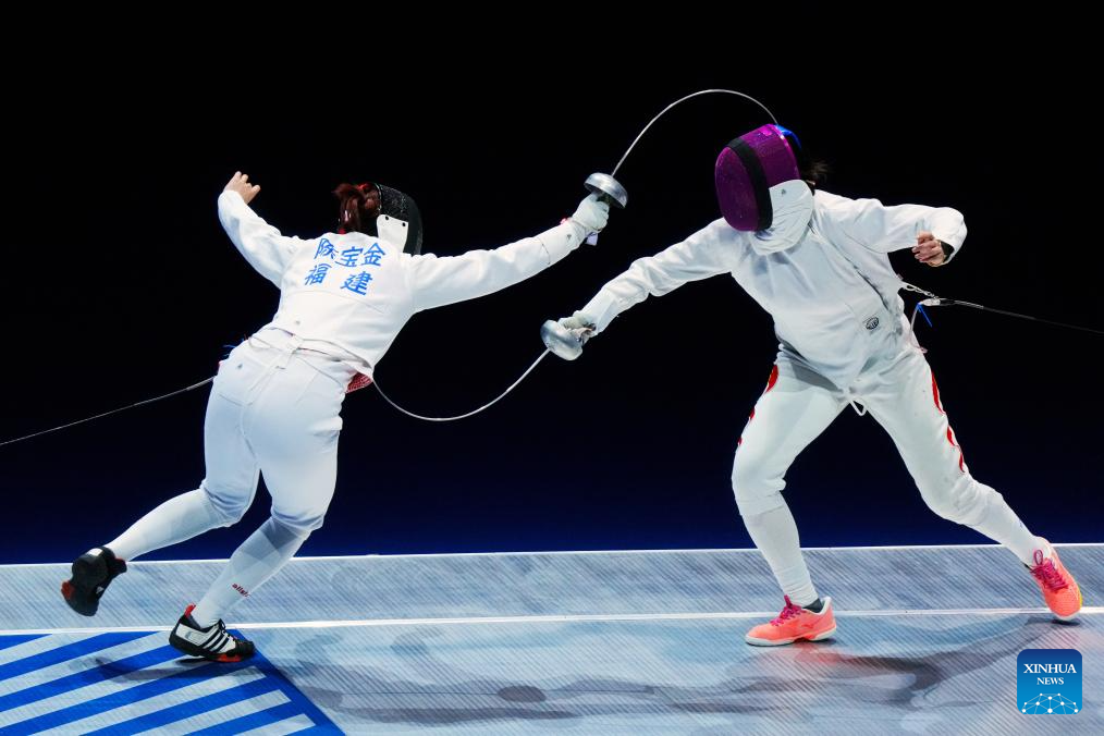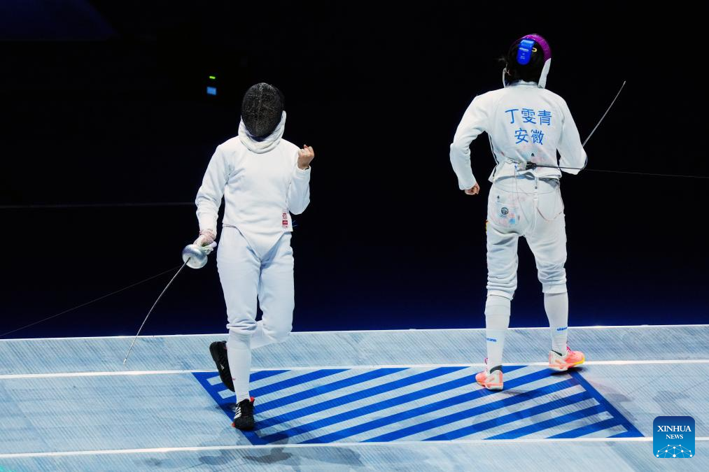 Chen Jinbao (L) of Fujian competes against Ding Wenqing of Anhui during the women's team epee final of fencing between Fujian and Anhui at China's 15th National Games in Hong Kong, south China, Nov. 18, 2025. (Xinhua/Zhu Wei)