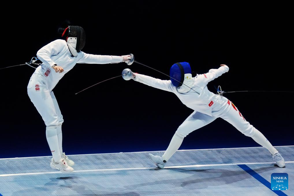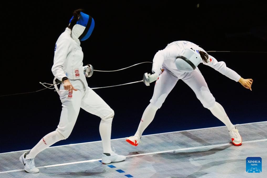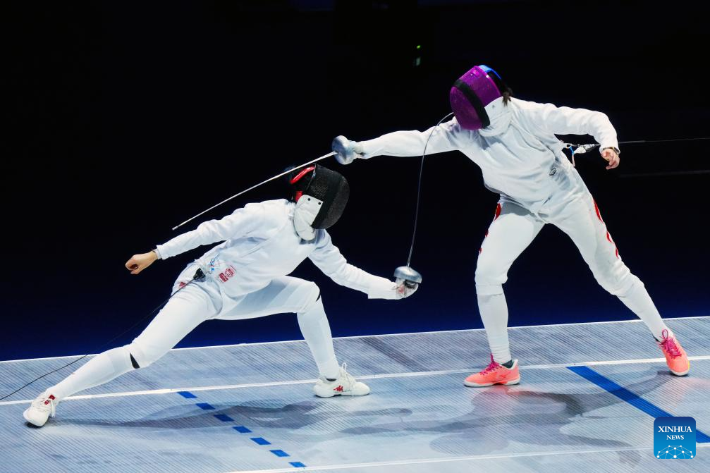 Yang Jingwen (L) of Fujian competes against Tang Junyao of Anhui during the women's team epee final of fencing between Fujian and Anhui at China's 15th National Games in Hong Kong, south China, Nov. 18, 2025. (Xinhua/Zhu Wei)
