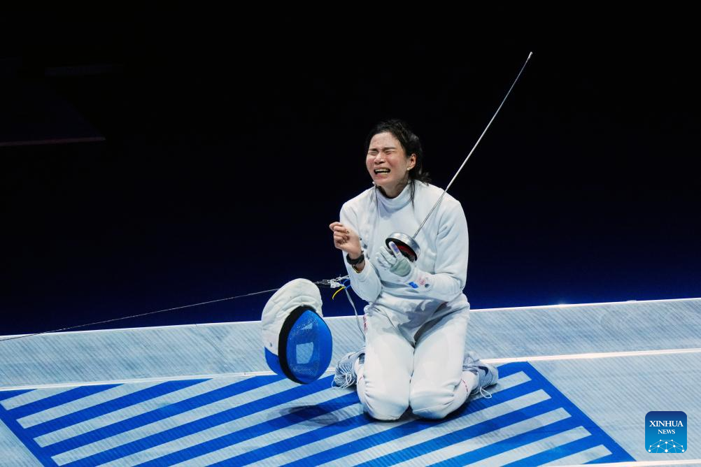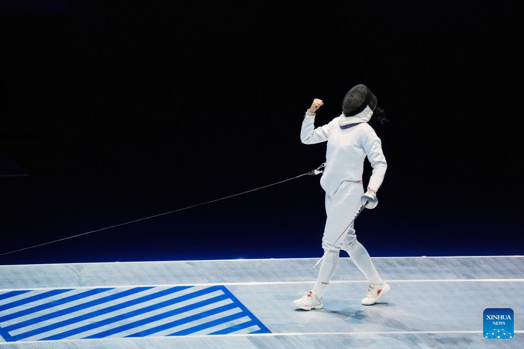 Yang Jingwen of Fujian celebrates scoring during the women's team epee final of fencing between Fujian and Anhui at China's 15th National Games in Hong Kong, south China, Nov. 18, 2025. (Xinhua/Zhu Wei)