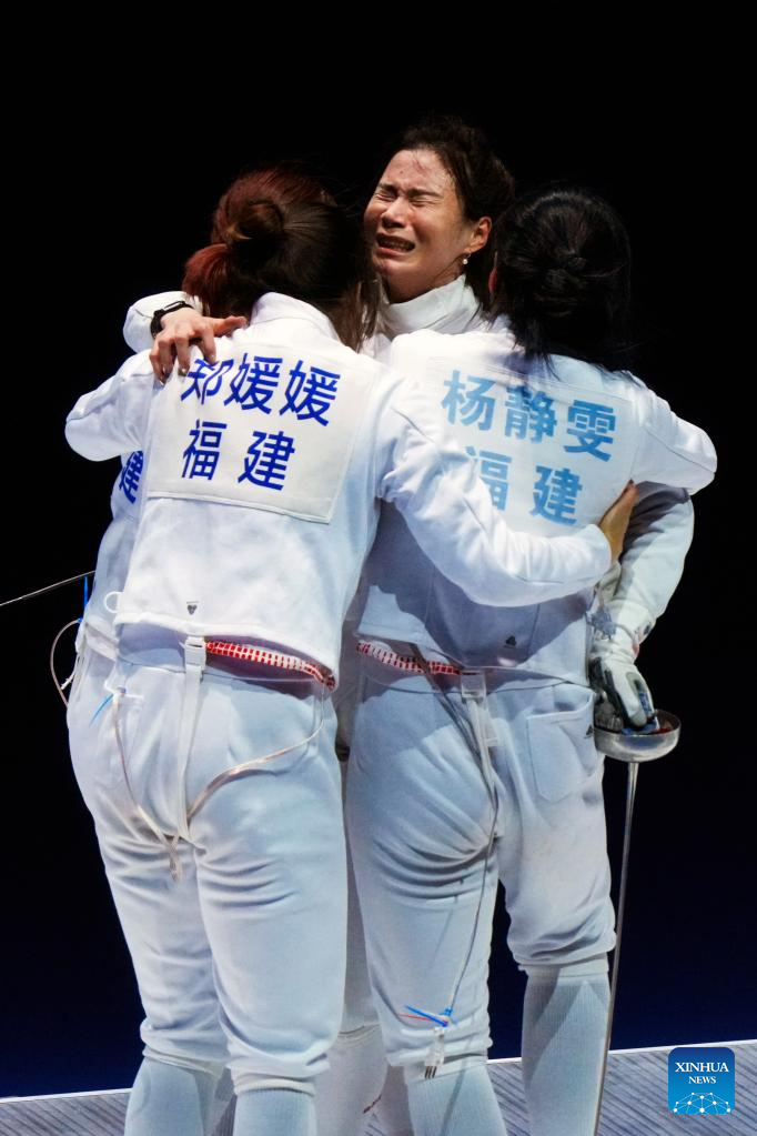 Lin Sheng (L) of Fujian celebrates after winning the women's team epee final of fencing between Fujian and Anhui at China's 15th National Games in Hong Kong, south China, Nov. 18, 2025. (Xinhua/Zhu Wei)
