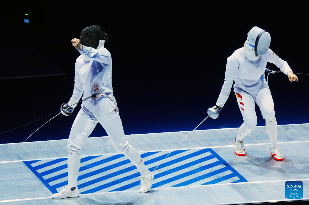 Chen Jinbao (L) of Fujian celebrates scoring against Ding Wenqing of Anhui during the women's team epee final of fencing between Fujian and Anhui at China's 15th National Games in Hong Kong, south China, Nov. 18, 2025. (Xinhua/Zhu Wei)