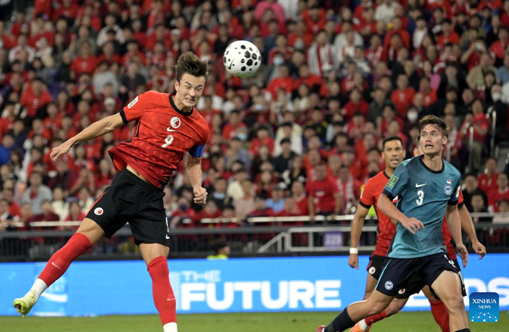 (251118) -- HONG KONG, Nov. 18, 2025 (Xinhua) -- Matt Orr (L) of China's Hong Kong competes during the AFC Asian Cup 2027 Qualifiers 3rd round group C football match between China's Hong Kong and Singapore in Hong Kong, south China, Nov. 18, 2025. (Xinhua/Lo Ping Fai)