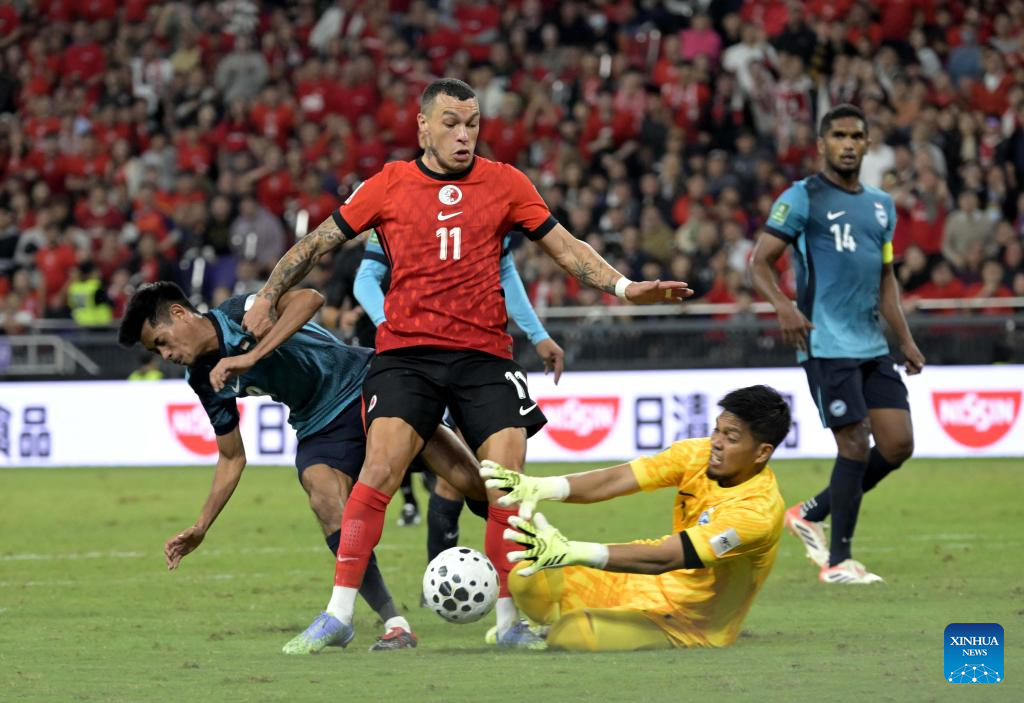 (251118) -- HONG KONG, Nov. 18, 2025 (Xinhua) -- Everton Camargo (front L) of China's Hong Kong vies with Izwan Mahbud (bottom), goalkeeper of Singapore during the AFC Asian Cup 2027 Qualifiers 3rd round group C football match between China's Hong Kong and Singapore in Hong Kong, south China, Nov. 18, 2025. (Xinhua/Lo Ping Fai)