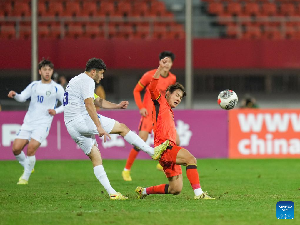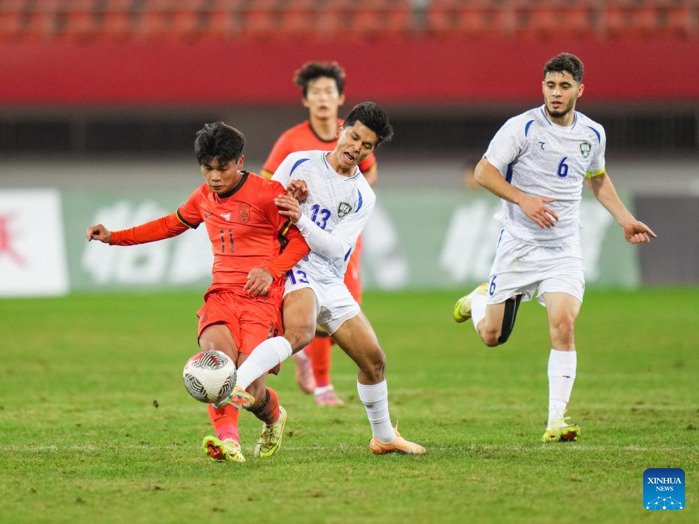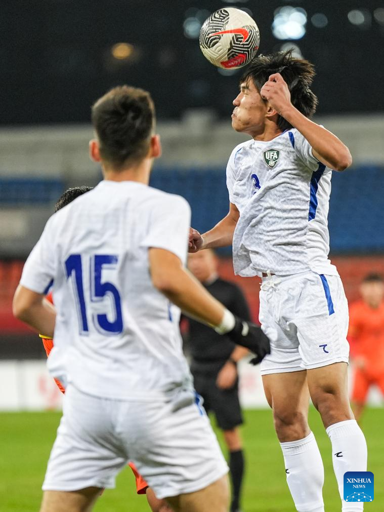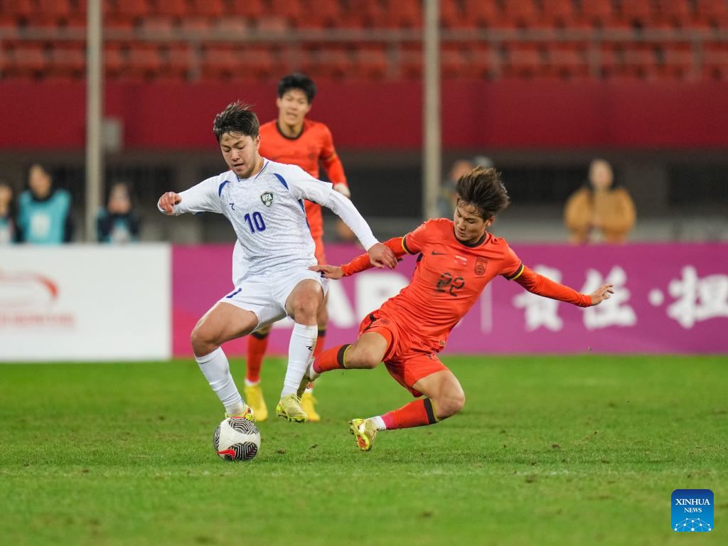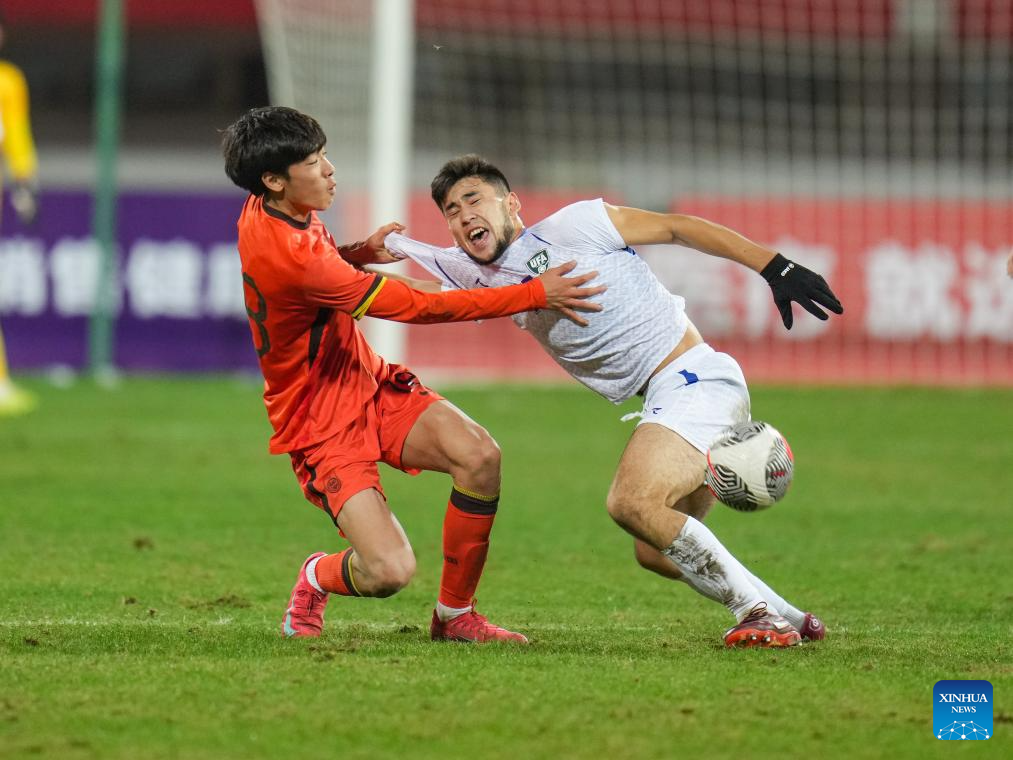 Dilshod Murtazaev (R) of Uzbekistan competes during a match between China's U22 national men's football team and Uzbekistan's U22 national men's football team at the CFA Team China Panda Cup International Tournament 2025 in Chengdu, southwest China's Sichuan Province, Nov. 18, 2025. (Xinhua/Wang Xi)