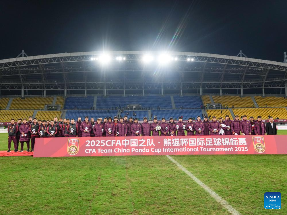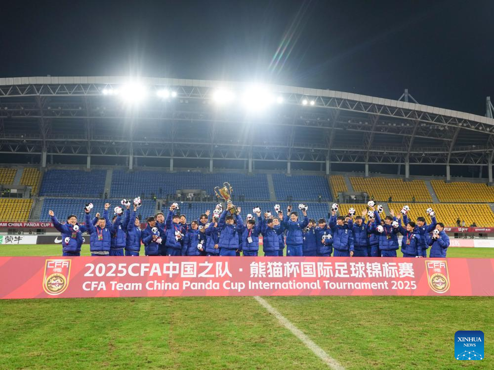 China's U22 national men's football team members are seen during the awarding ceremony at the CFA Team China Panda Cup International Tournament 2025 in Chengdu, southwest China's Sichuan Province, Nov. 18, 2025. (Xinhua/Wang Xi)