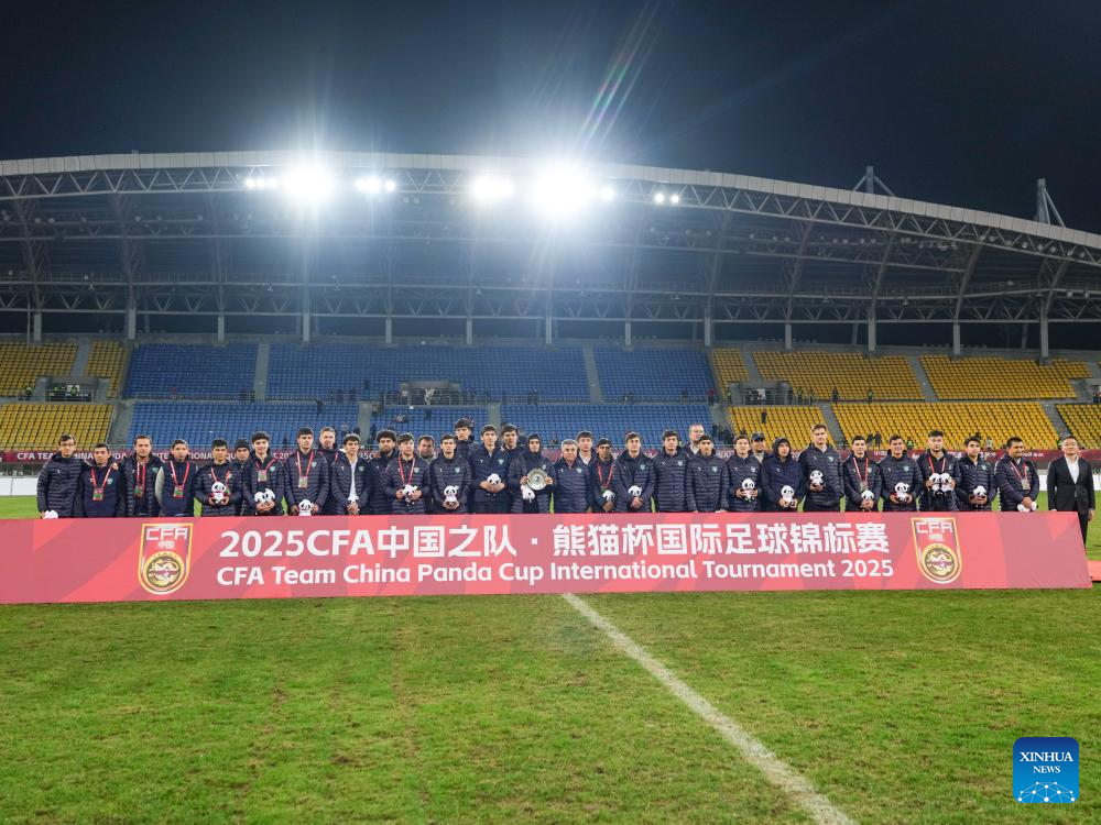 Uzbekistan's U22 national men's football team members are seen during the awarding ceremony at the CFA Team China Panda Cup International Tournament 2025 in Chengdu, southwest China's Sichuan Province, Nov. 18, 2025. (Xinhua/Wang Xi)