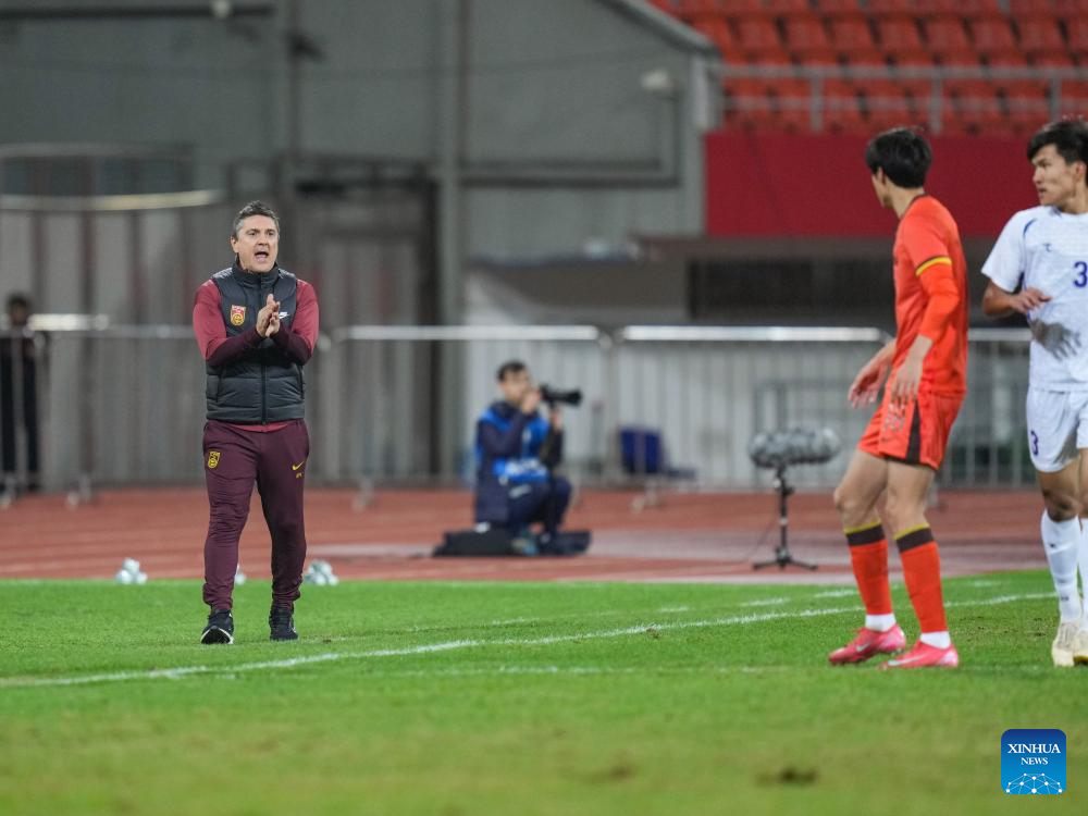 Head coach Antonio Puche (L) of China is seen during a match between China's U22 national men's football team and Uzbekistan's U22 national men's football team at the CFA Team China Panda Cup International Tournament 2025 in Chengdu, southwest China's Sichuan Province, Nov. 18, 2025. (Xinhua/Wang Xi)