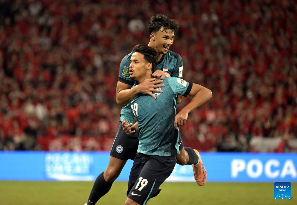 (251118) -- HONG KONG, Nov. 18, 2025 (Xinhua) -- Ilhan Fandi (front) and Ikhsan Fandi of Singapore celebrate during the AFC Asian Cup 2027 Qualifiers 3rd round group C football match between China's Hong Kong and Singapore in Hong Kong, south China, Nov. 18, 2025. (Xinhua/Lo Ping Fai)