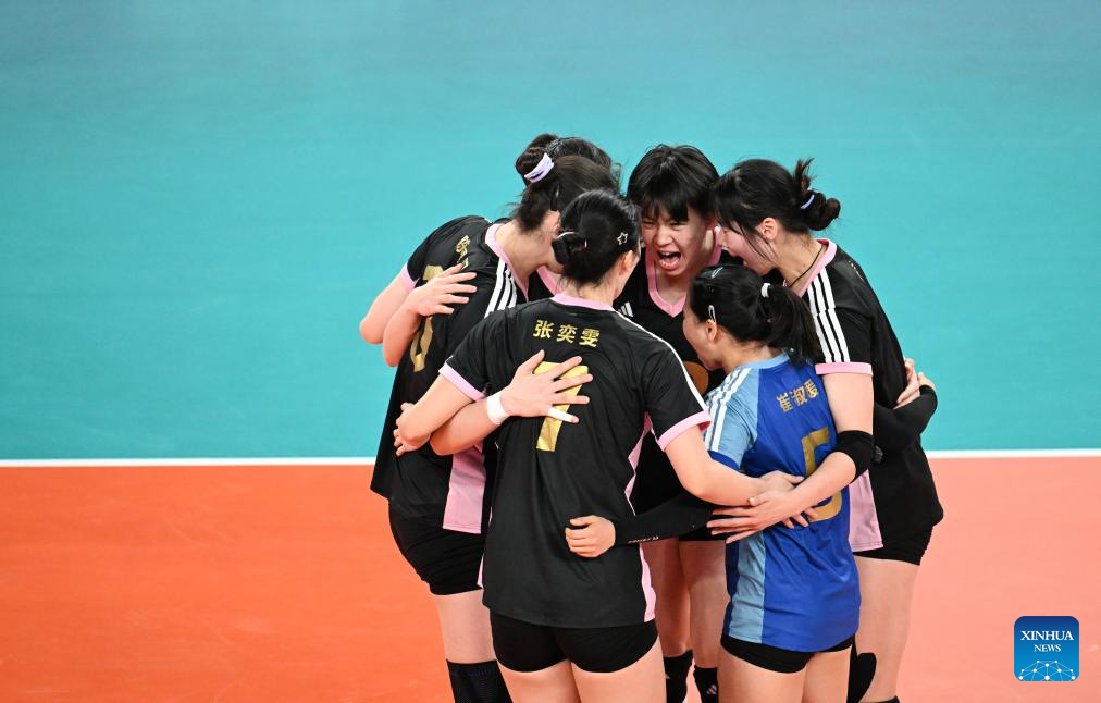 Players of Shanghai celebrate scoring during the volleyball women's U20 final between Shandong and Shanghai at China's 15th National Games in Jiangmen, south China's Guangdong Province, Nov. 18, 2025. (Xinhua/Chen Zhonghao)