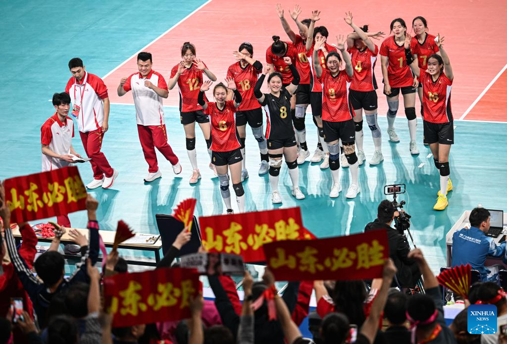 Players of Shandong greet the spectators after winning the volleyball women's U20 final between Shandong and Shanghai at China's 15th National Games in Jiangmen, south China's Guangdong Province, Nov. 18, 2025. (Xinhua/Chen Zhonghao)