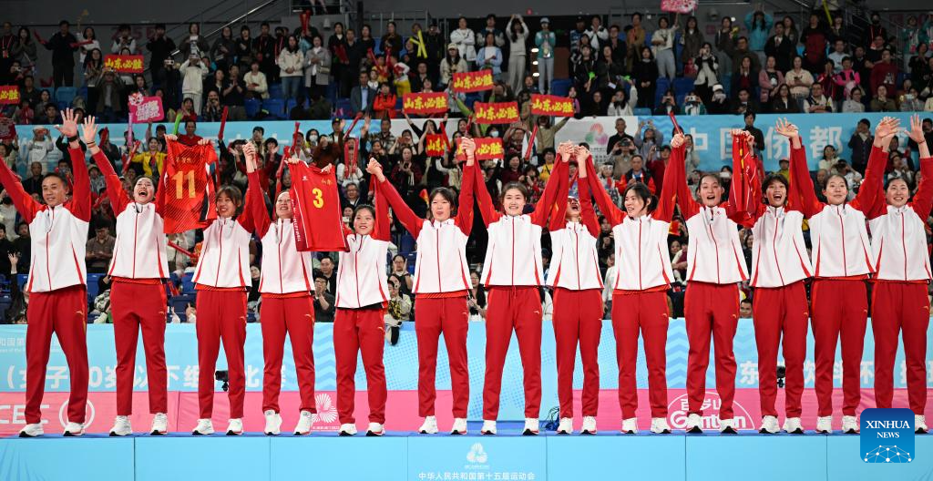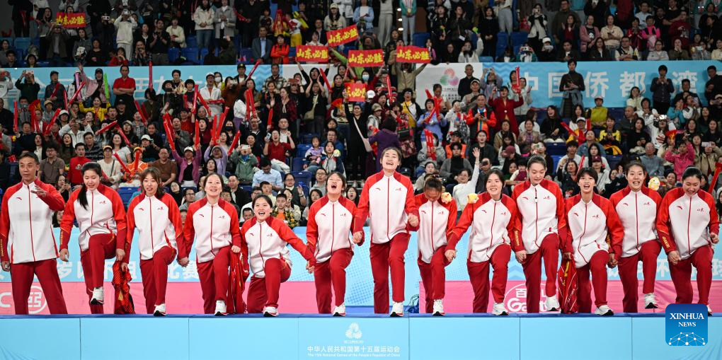 Gold medalists team Shandong are seen during the awarding ceremony for the volleyball women's U20 at China's 15th National Games in Jiangmen, south China's Guangdong Province, Nov. 18, 2025. (Xinhua/Chen Zhonghao)