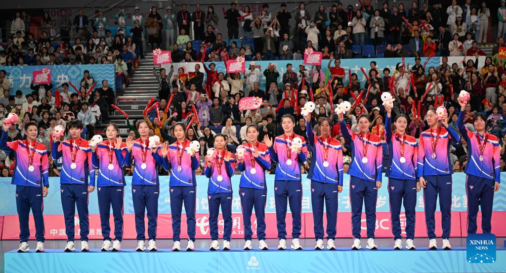 Silver medalists team Shanghai are seen during the awarding ceremony for the volleyball women's U20 at China's 15th National Games in Jiangmen, south China's Guangdong Province, Nov. 18, 2025. (Xinhua/Chen Zhonghao)