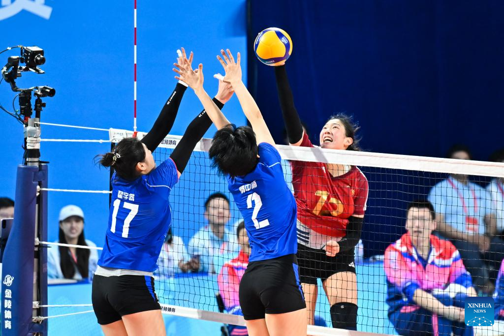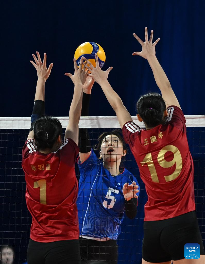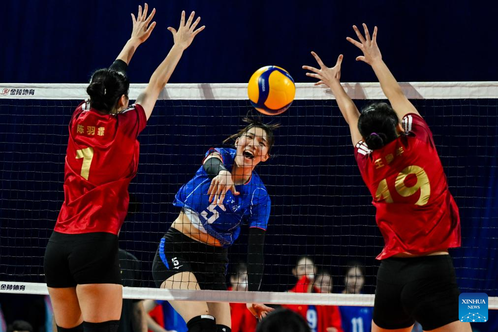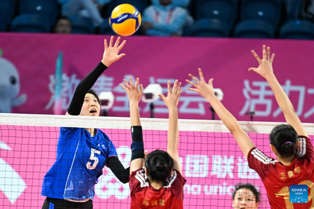 Chen Jiayu (C) of Jiangsu competes during the volleyball women's U18 final between Jiangsu and Shanghai at China's 15th National Games in Shenzhen, south China's Guangdong Province, Nov. 18, 2025. (Xinhua/Lian Zhen)