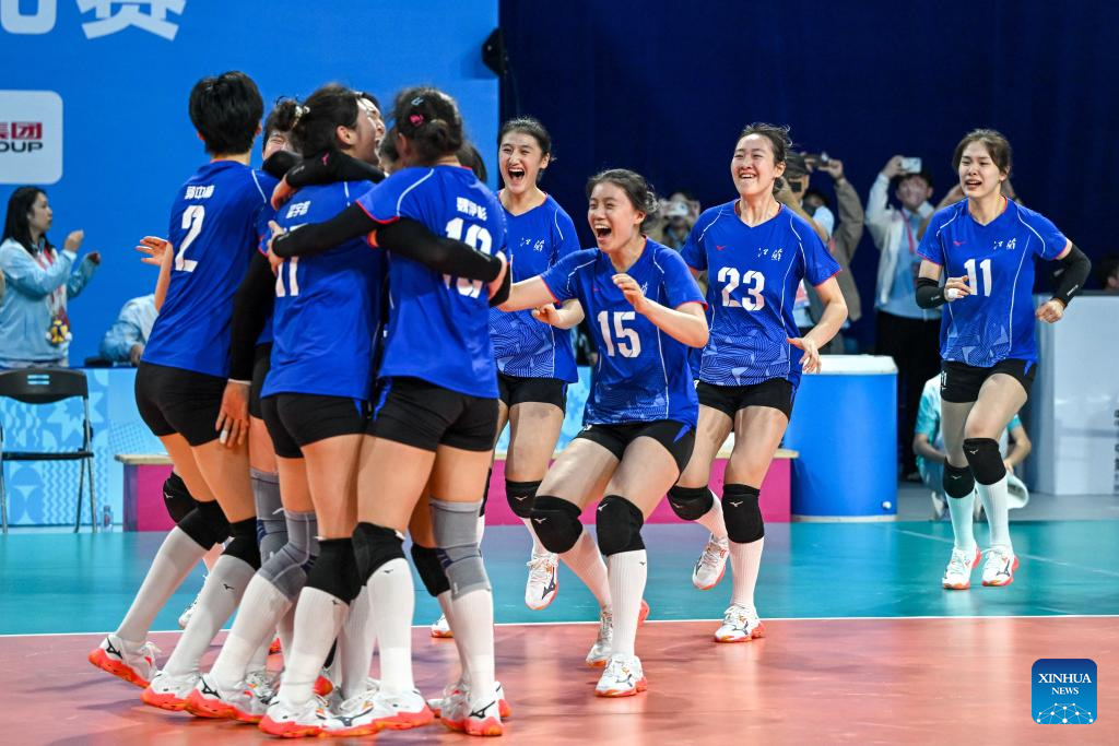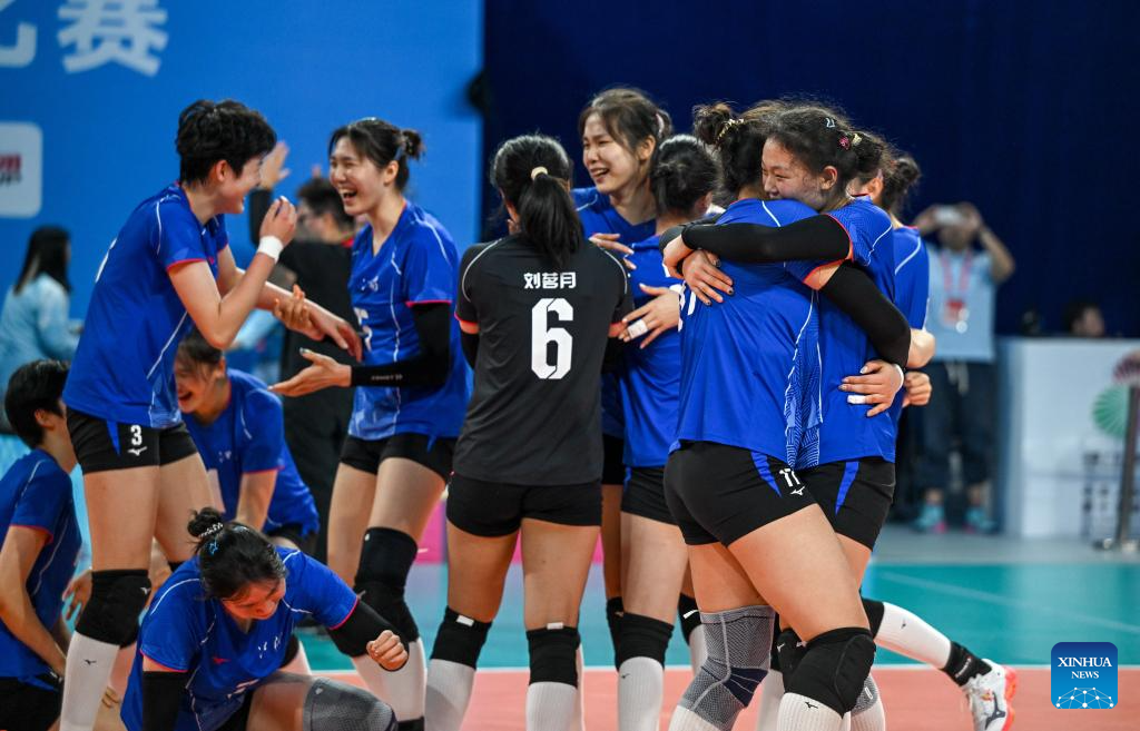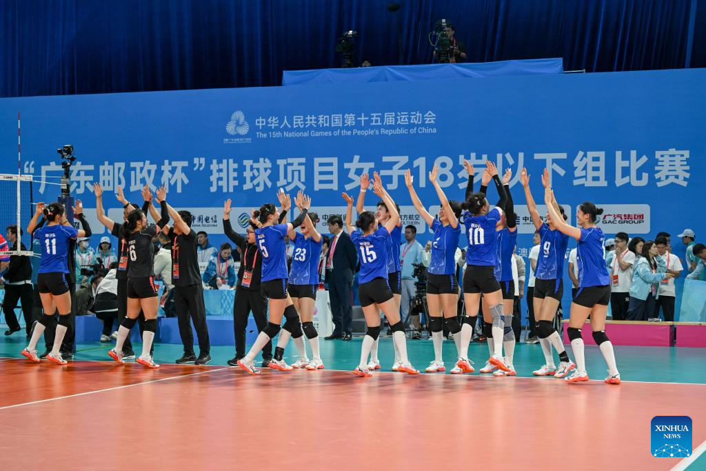 Players of Jiangsu celebrate winning the volleyball women's U18 final between Jiangsu and Shanghai at China's 15th National Games in Shenzhen, south China's Guangdong Province, Nov. 18, 2025. (Xinhua/Lian Zhen)