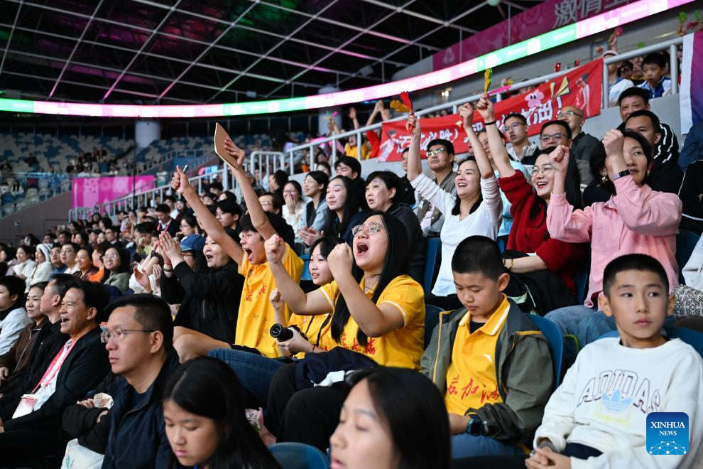 Spectators cheer during the volleyball women's U18 final between Jiangsu and Shanghai at China's 15th National Games in Shenzhen, south China's Guangdong Province, Nov. 18, 2025. (Xinhua/Li Zhipeng)