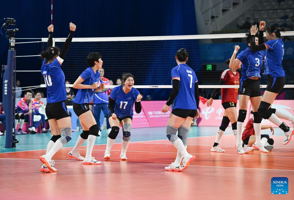 Players of Jiangsu celebrate scoring during the volleyball women's U18 final between Jiangsu and Shanghai at China's 15th National Games in Shenzhen, south China's Guangdong Province, Nov. 18, 2025. (Xinhua/Lian Zhen)