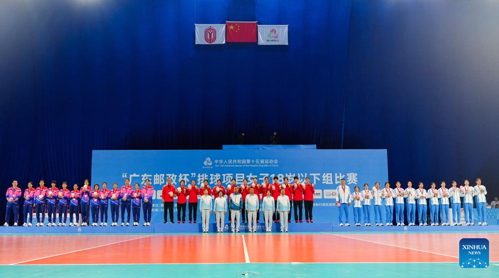Gold medalists team Jiangsu, silver medalists team Shanghai and bronze medalists team Zhejiang pose for photos during the awarding ceremony for the volleyball women's U18 at China's 15th National Games in Shenzhen, south China's Guangdong Province, Nov. 18, 2025. (Xinhua/Chen Sihan)