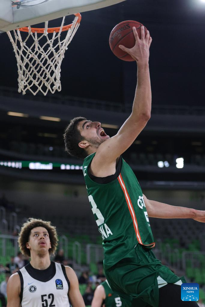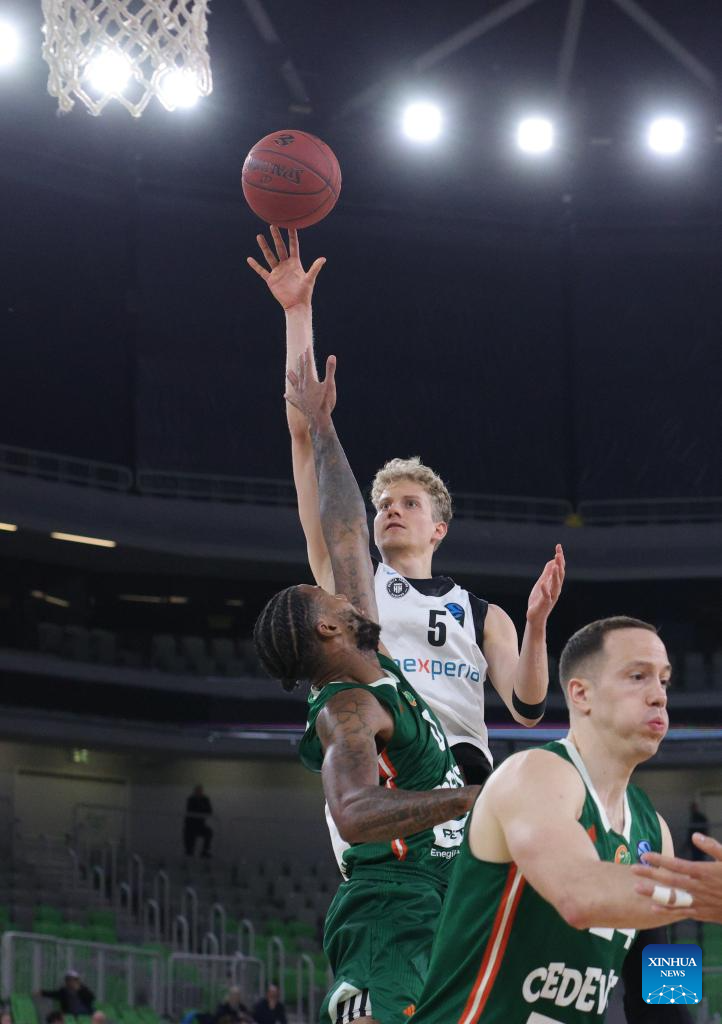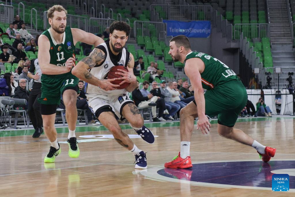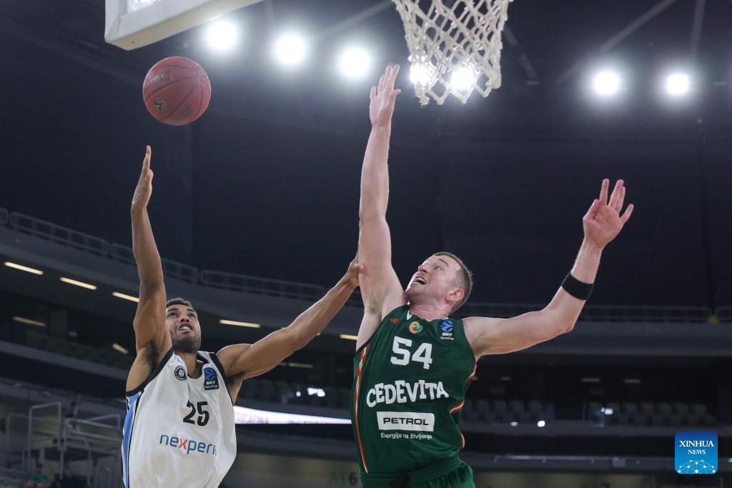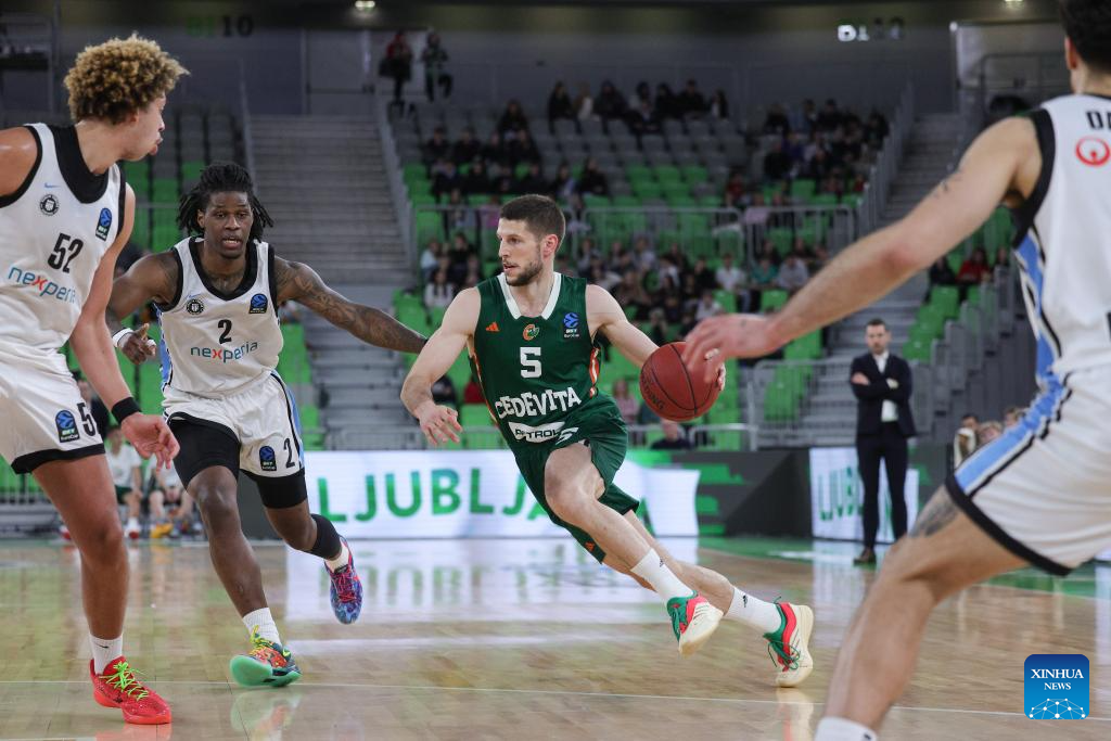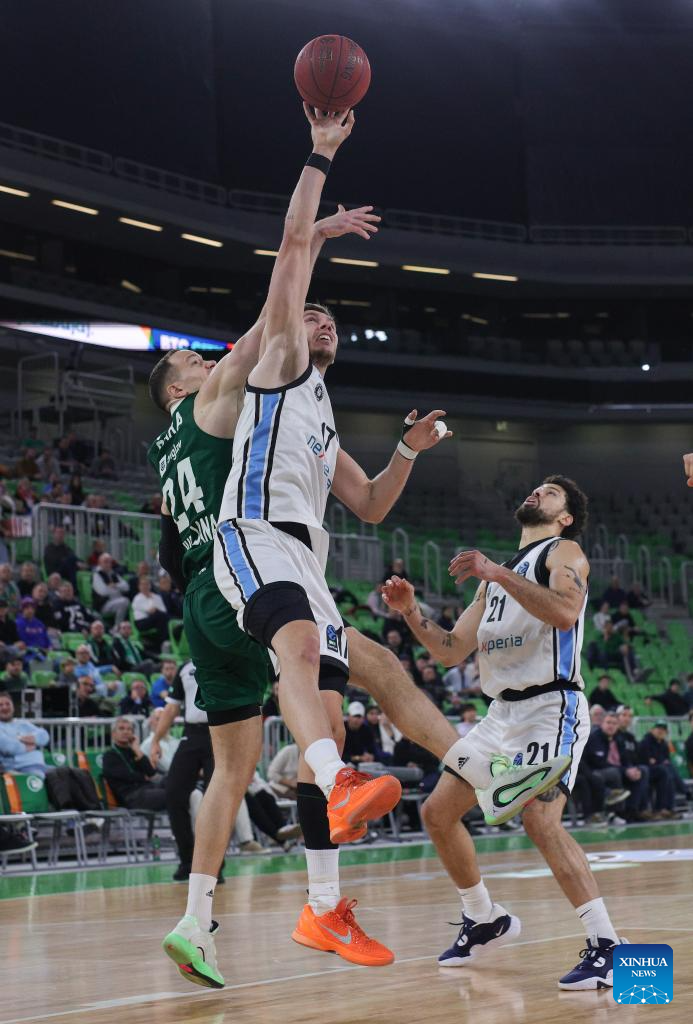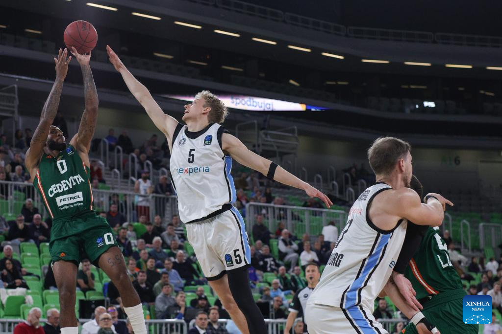Aleksej Nikolic (3rd L) of Cedevita Olimpija Ljublajan competes during the BKT Eurocup 2025/26 match between Cedevita Olimpija Ljubljana and Veolia Towers Hamburg in Ljubljana, Slovenia, Nov. 19, 2025. (Photo by Zeljko Stevanic/Xinhua)