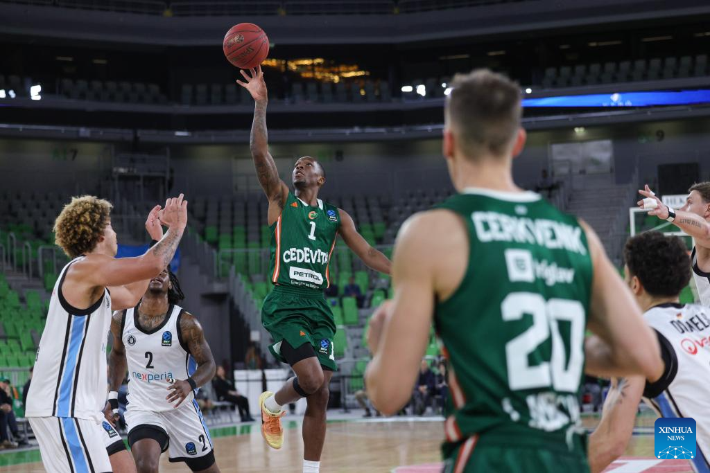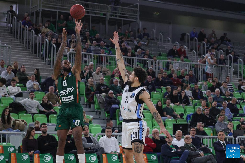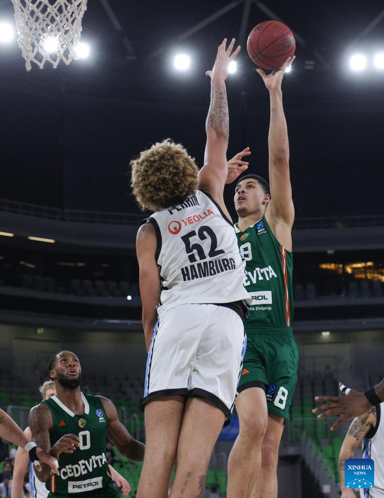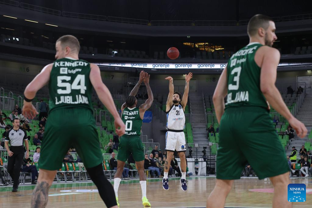 DJ Stewart (top L) of Cedevita Olimpija Ljubljana shoots during the BKT Eurocup 2025/26 match between Cedevita Olimpija Ljubljana and Veolia Towers Hamburg in Ljubljana, Slovenia, Nov. 19, 2025. (Photo by Zeljko Stevanic/Xinhua)