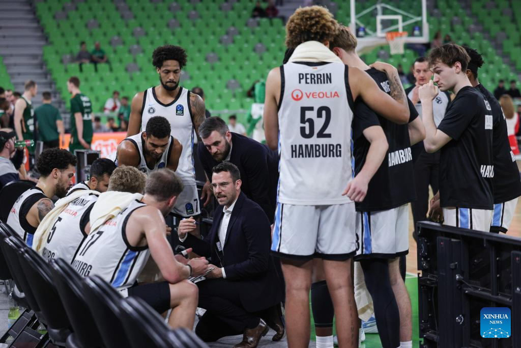 Benka Barloschky (C), head coach of Veolia Towers Hamburg, gives instructions to the players during the BKT Eurocup 2025/26 match between Cedevita Olimpija Ljubljana and Veolia Towers Hamburg in Ljubljana, Slovenia, Nov. 19, 2025. (Photo by Zeljko Stevanic/Xinhua)