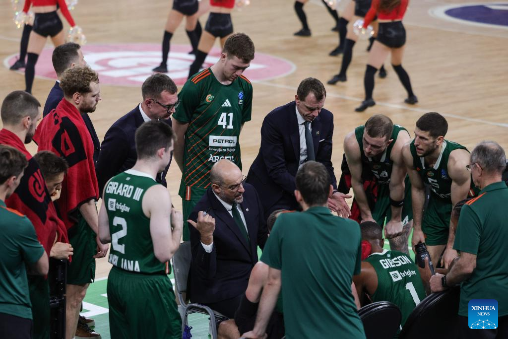 Zvezdan Mtrovic (C), head coach of Cedevita Olimpija Ljubljana, gives instructions to players during the BKT Eurocup 2025/26 match between Cedevita Olimpija Ljubljana and Veolia Towers Hamburg in Ljubljana, Slovenia, Nov. 19, 2025. (Photo by Zeljko Stevanic/Xinhua)