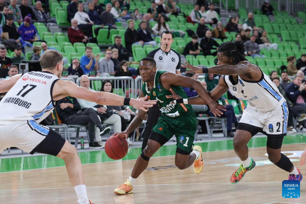 Devon Daniels IV (C) of Veolia Towers Hamburg competes during the BKT Eurocup 2025/26 match between Cedevita Olimpija Ljubljana and Veolia Towers Hamburg in Ljubljana, Slovenia, Nov. 19, 2025. (Photo by Zeljko Stevanic/Xinhua)