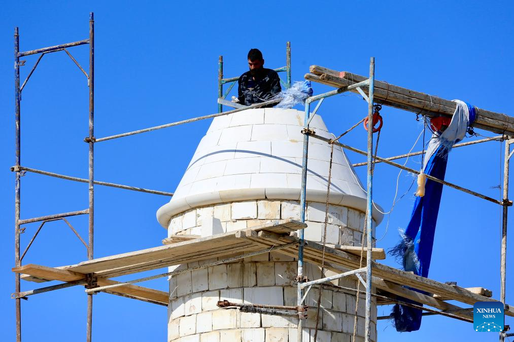 Workers work during the restoration process of the shrine of Prophet Shimon al-Safa destroyed by Israeli forces during fighting with Hezbollah in Chamaa, southern Lebanon, Nov. 19, 2025.