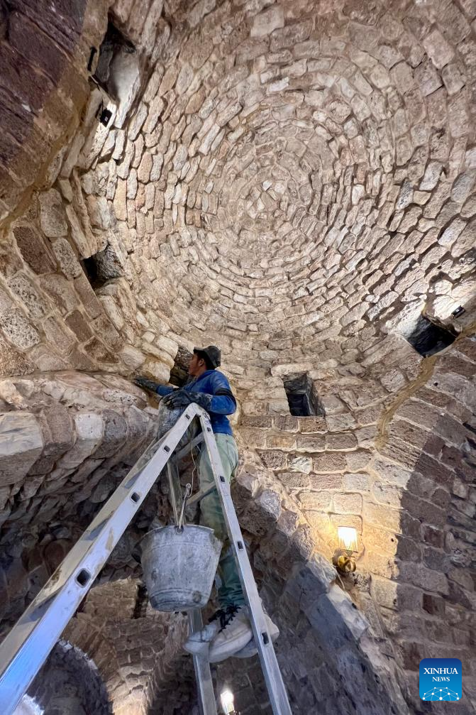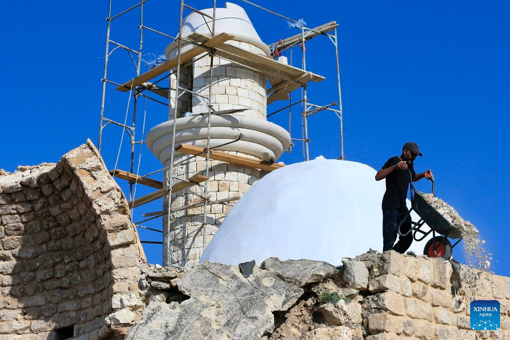 A worker works during the restoration process of the shrine of Prophet Shimon al-Safa destroyed by Israeli forces during fighting with Hezbollah in Chamaa, southern Lebanon, Nov. 19, 2025.