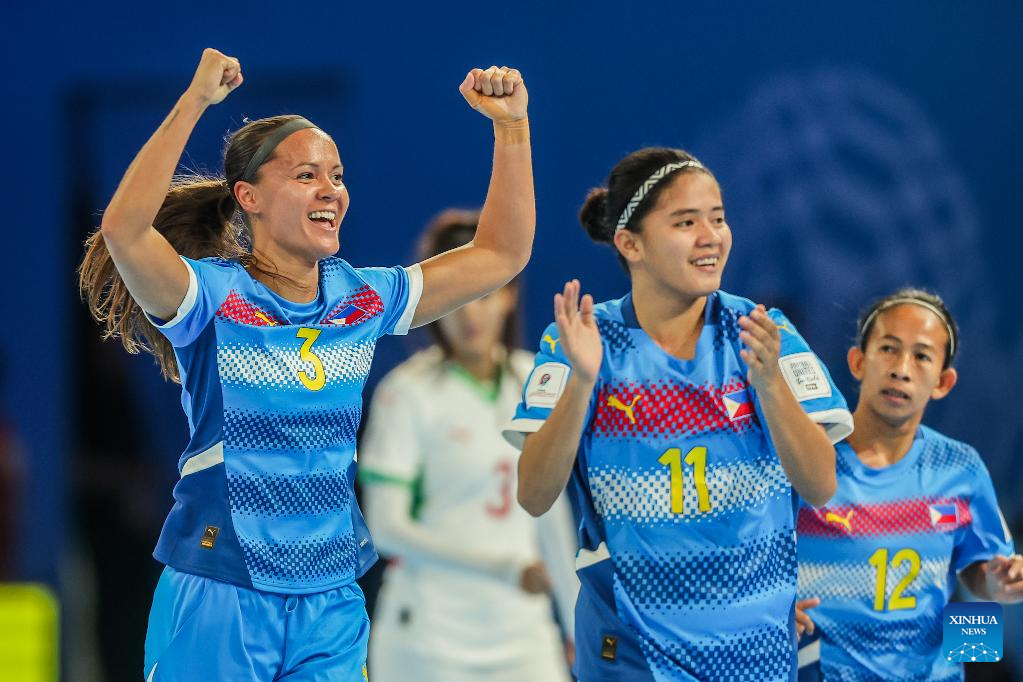 Players of the Philippines celebrate after scoring a goal during the group A match between Morocco and the Philippines at the FIFA Futsal Women's World Cup 2025 in Pasig City, the Philippines, Nov. 24, 2025. (Xinhua/Rouelle Umali)