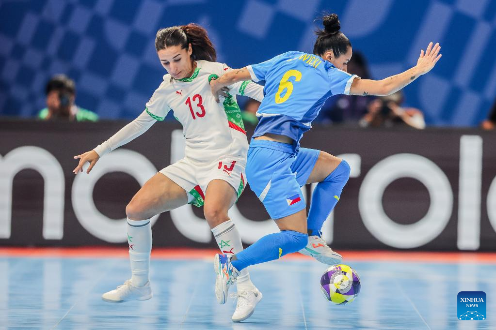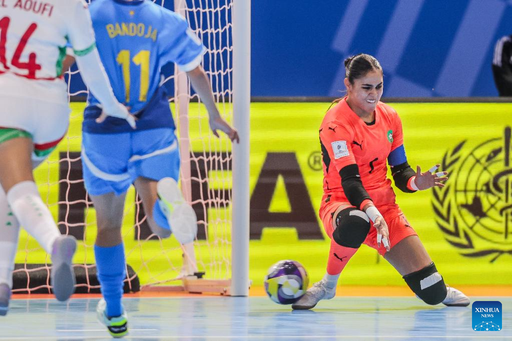 Goalkeeper Kawtar Bentaleb (R) of Morocco competes during the group A match between Morocco and the Philippines at the FIFA Futsal Women's World Cup 2025 in Pasig City, the Philippines, Nov. 24, 2025. (Xinhua/Rouelle Umali)