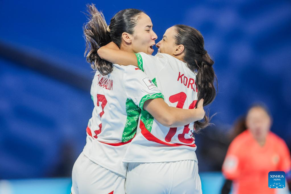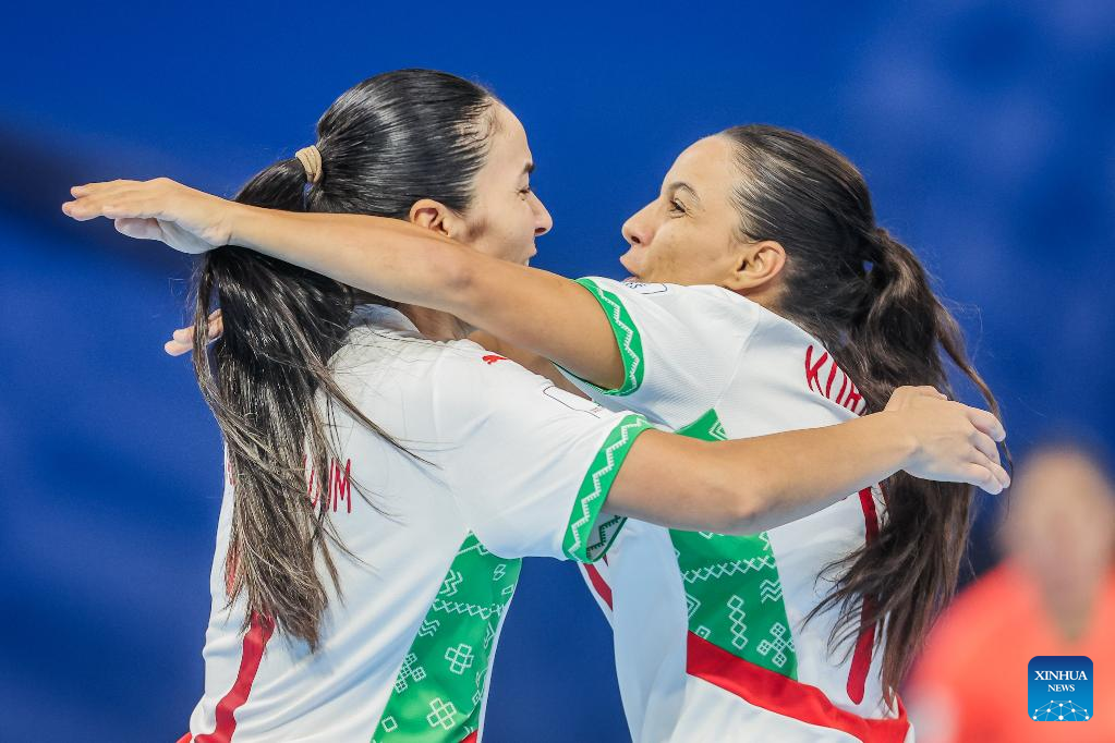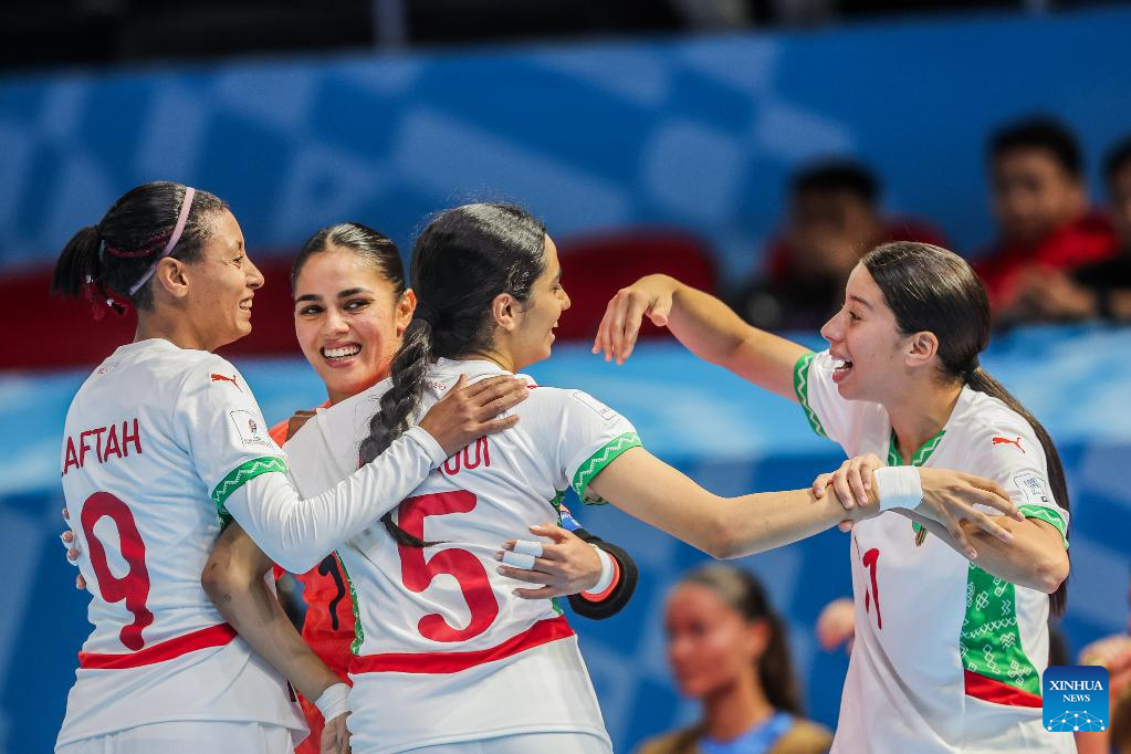 Players of Morocco celebrate after scoring a goal during the group A match between Morocco and the Philippines at the FIFA Futsal Women's World Cup 2025 in Pasig City, the Philippines, Nov. 24, 2025. (Xinhua/Rouelle Umali)