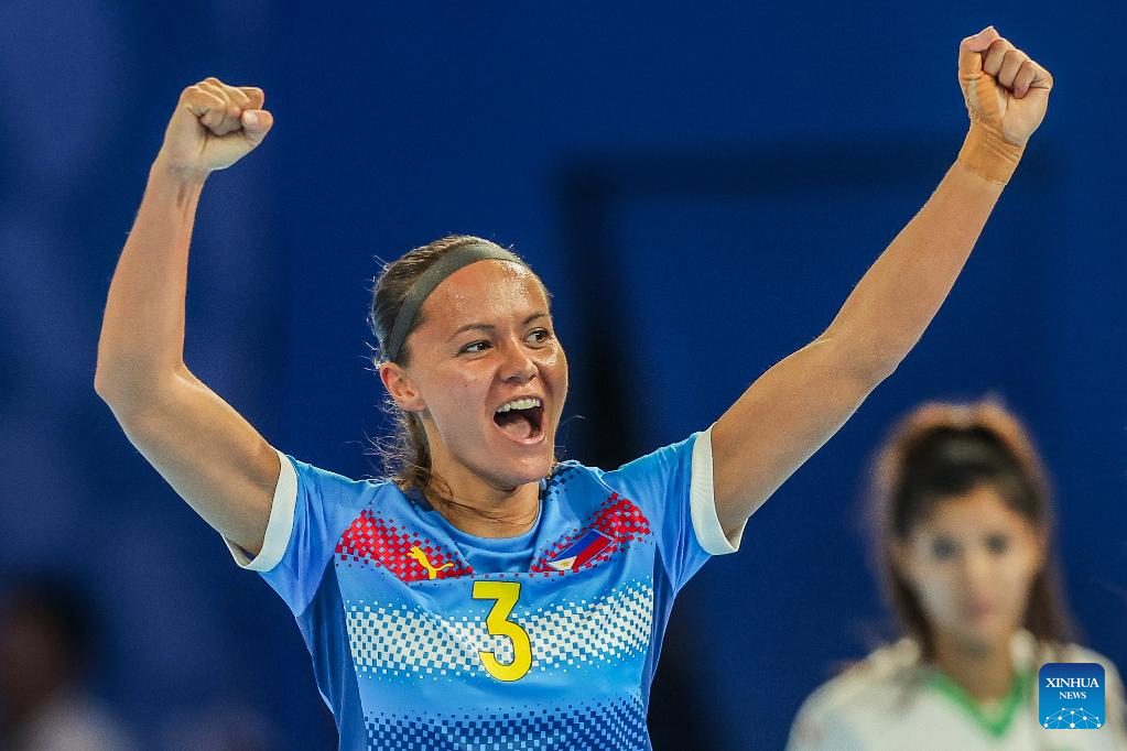 Cathrine Graversen of the Philippines celebrates after scoring a goal during the group A match between Morocco and the Philippines at the FIFA Futsal Women's World Cup 2025 in Pasig City, the Philippines, Nov. 24, 2025. (Xinhua/Rouelle Umali)