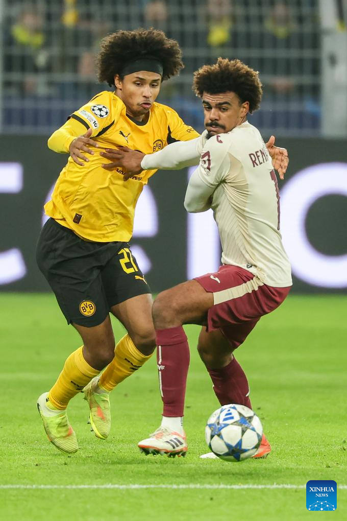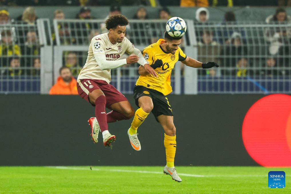 Karim Adeyemi (L) of Borussia Dortmund vies with Sergi Cardona (C) of Villarreal CF during the UEFA Champions League group stage 5th round match between Borussia Dortmund and Villarreal CF in Dortmund, Germany, Nov. 25, 2025. (Photo by Joachim Bywaletz/Xinhua)