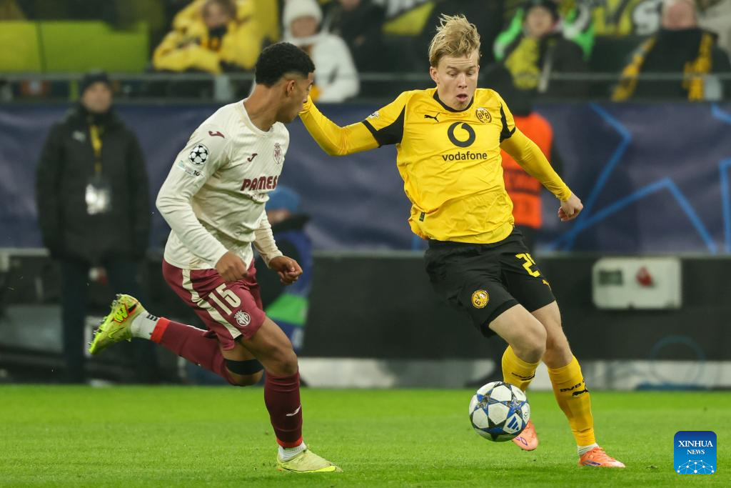 Daniel Svensson (R) of Borussia Dortmund vies with Santiago Mourino of Villarreal CF during the UEFA Champions League group stage 5th round match between Borussia Dortmund and Villarreal CF in Dortmund, Germany, Nov. 25, 2025. (Photo by Joachim Bywaletz/Xinhua)