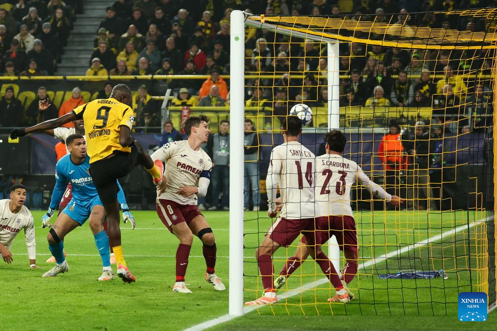 Serhou Guirassy (3rd L) of Borussia Dortmund shoots to score during the UEFA Champions League group stage 5th round match between Borussia Dortmund and Villarreal CF in Dortmund, Germany, Nov. 25, 2025. (Photo by Joachim Bywaletz/Xinhua)