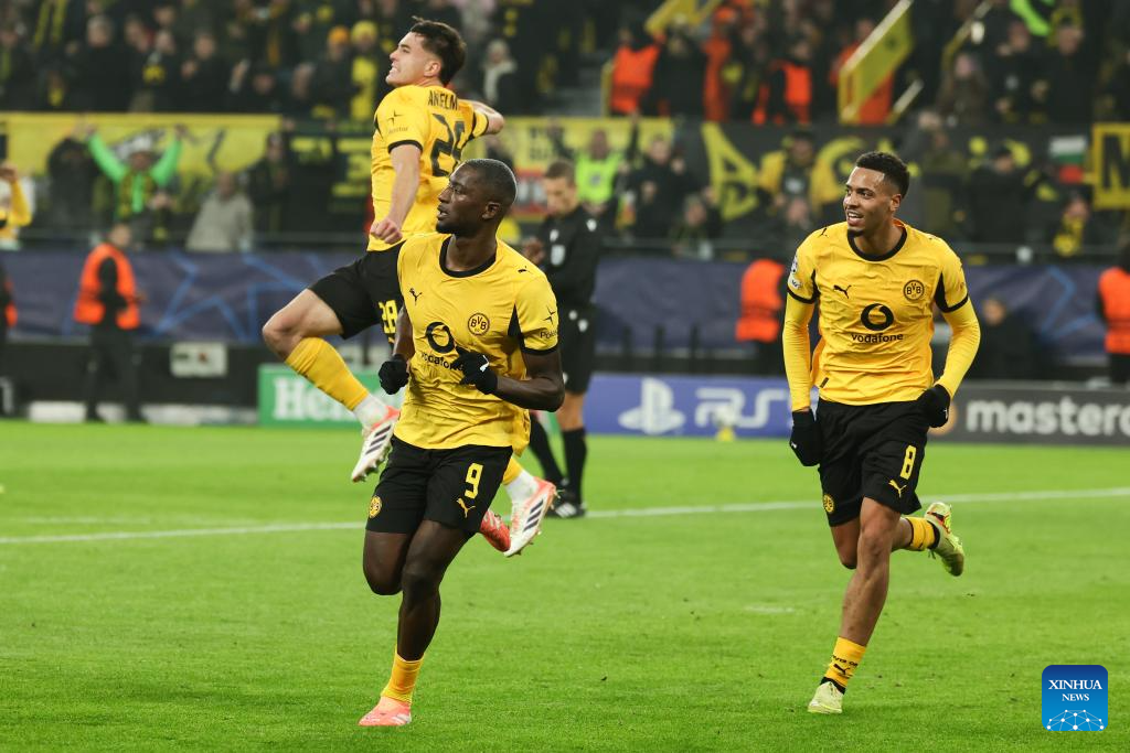 Players of Borussia Dortmund celebrate scoring during the UEFA Champions League group stage 5th round match between Borussia Dortmund and Villarreal CF in Dortmund, Germany, Nov. 25, 2025. (Photo by Joachim Bywaletz/Xinhua)
