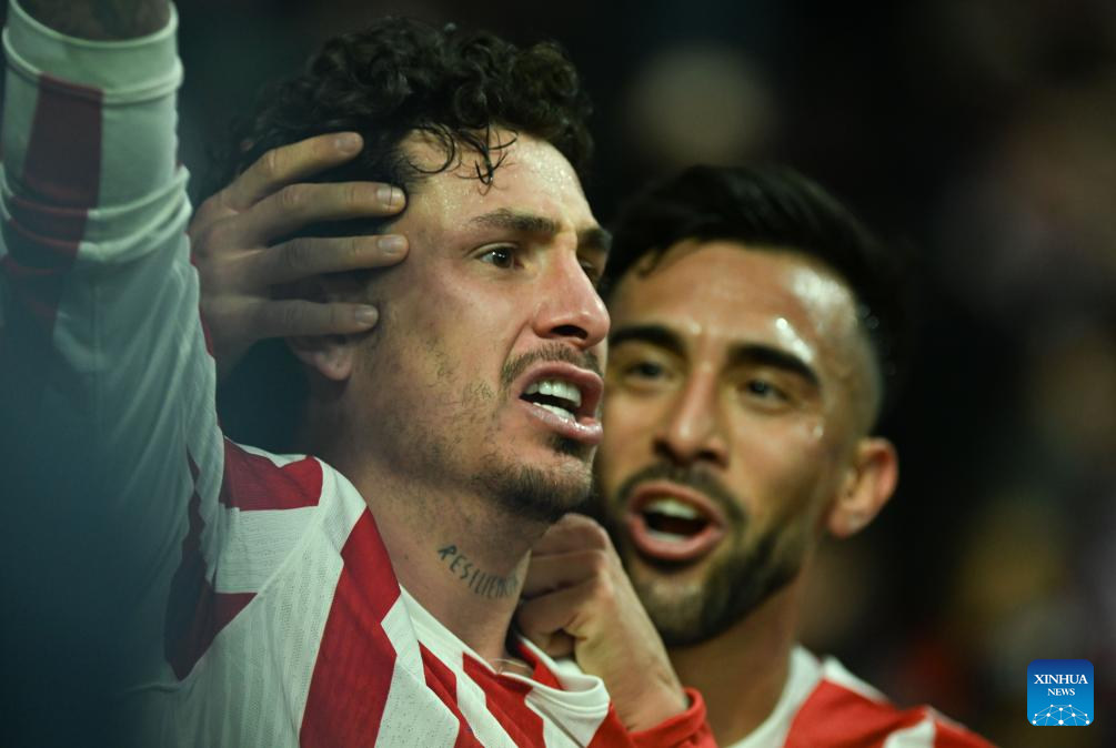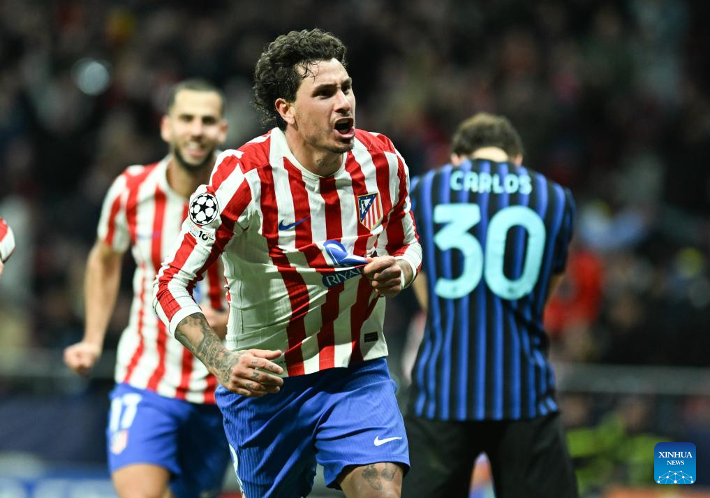 Jose Maria Gimenez (front) of Atletico de Madrid celebrates a goal during the UEFA Champions League football match between Atletico de Madrid and Inter Milan in Madrid, Spain, Nov. 26, 2025. (Xinhua/Cheng Min)