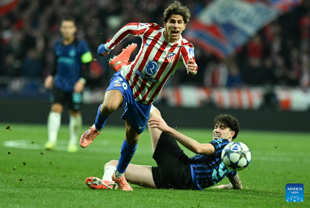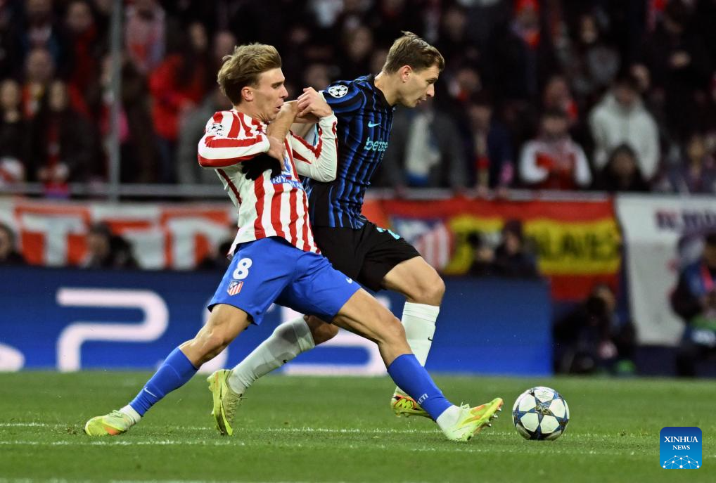 Pablo Barrios (L) of Atletico de Madrid competes during the UEFA Champions League football match between Atletico de Madrid and Inter Milan in Madrid, Spain, Nov. 26, 2025. (Xinhua/Cheng Min)