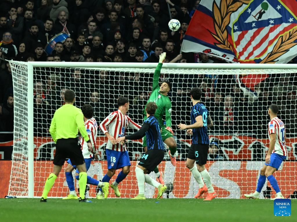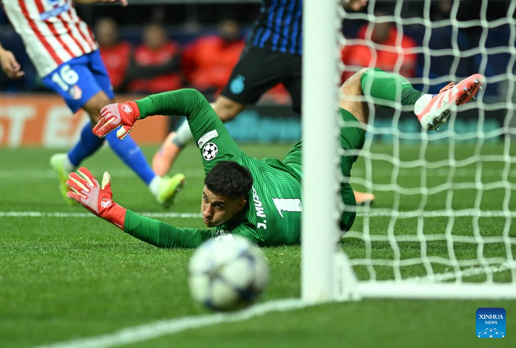 Juan Muss (top), goalkeeper of Atletico de Madrid, makes a save during the UEFA Champions League football match between Atletico de Madrid and Inter Milan in Madrid, Spain, Nov. 26, 2025. (Xinhua/Cheng Min)