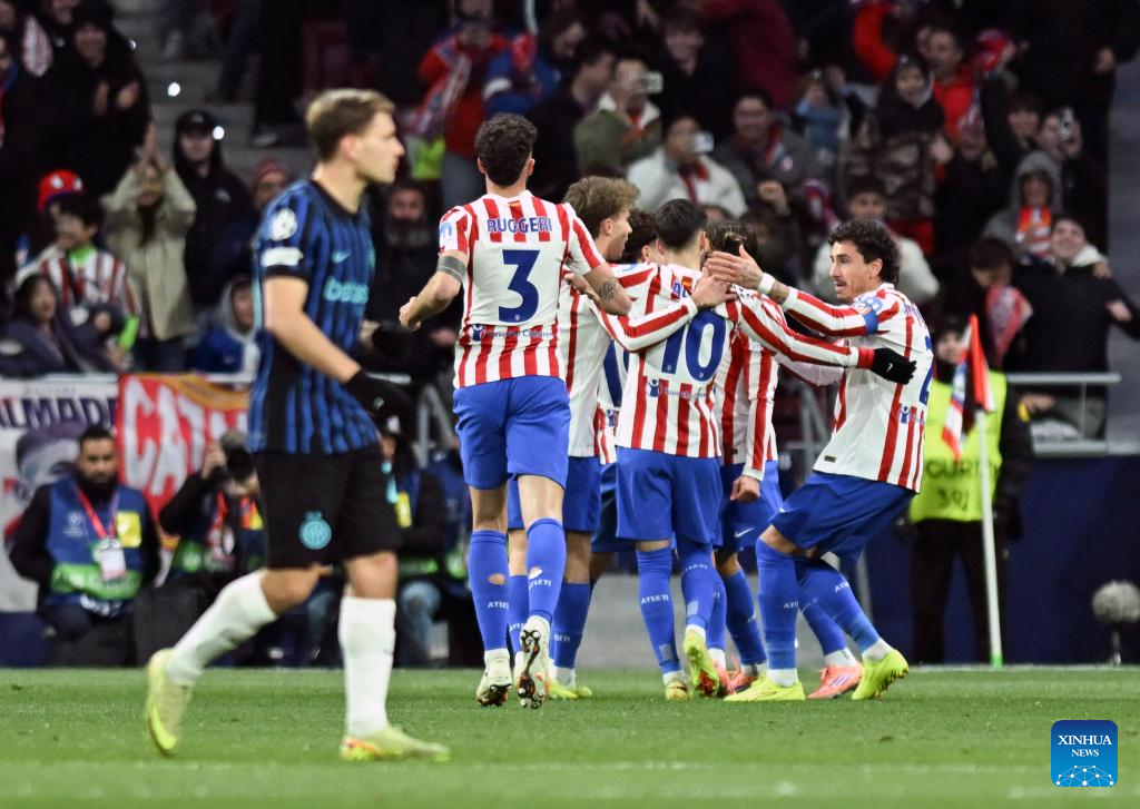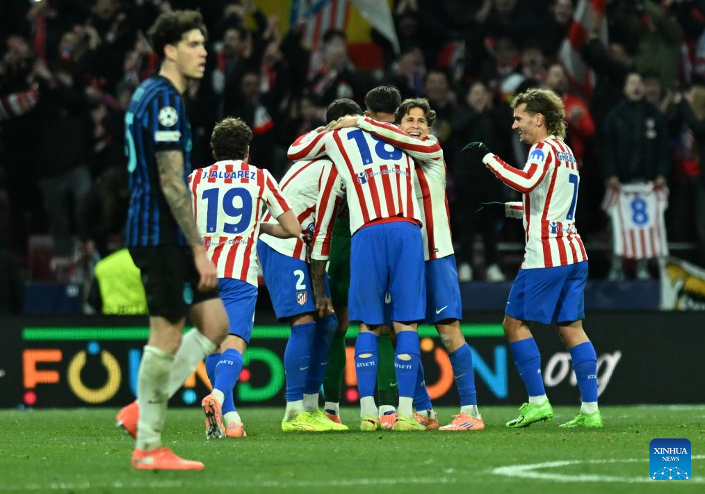 Players of Atletico de Madrid celebrate a goal during the UEFA Champions League football match between Atletico de Madrid and Inter Milan in Madrid, Spain, Nov. 26, 2025. (Xinhua/Cheng Min)